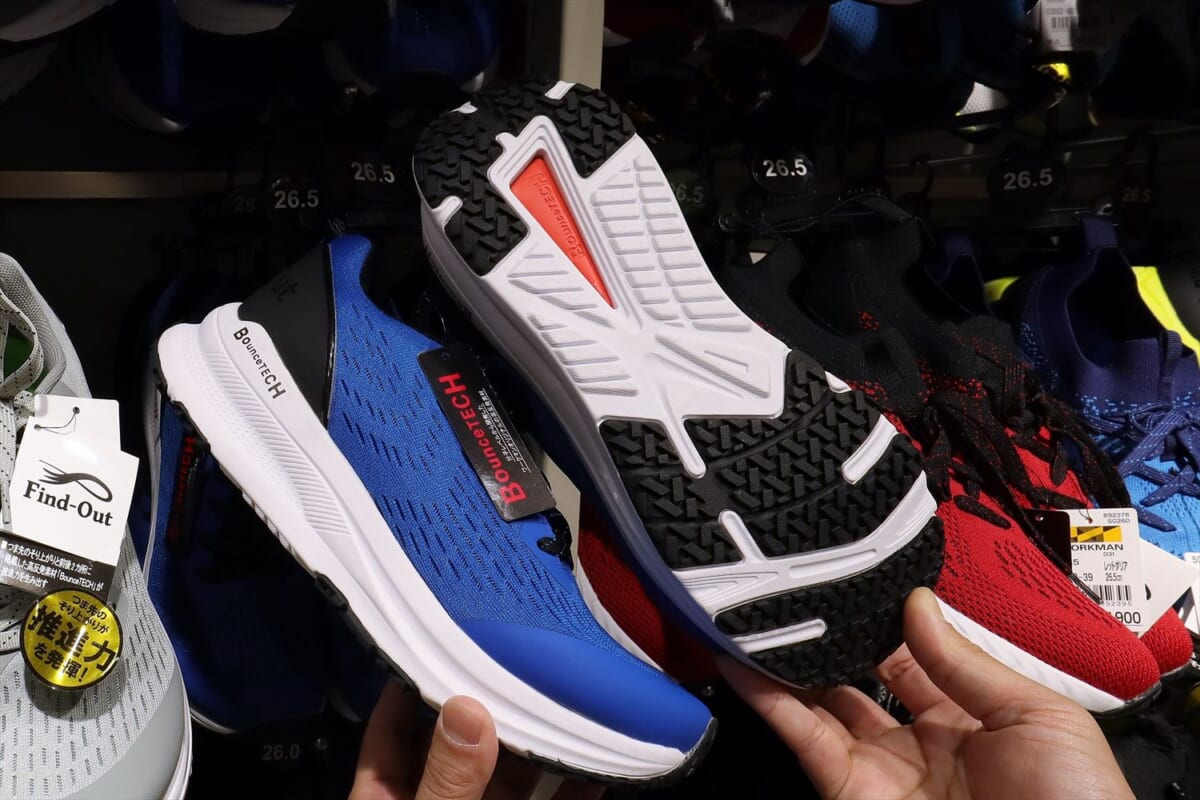 次からは春夏新作の注目ウェアを見ていきましょう。まずはランニングシューズです。「アスレシューズ ハイバウンス ドリブンソール」は、通称“履くだけで前に進むシューズ”。かかと部分はクッション性の高い素材で地面からの衝撃を吸収し、つま先部分には反発力のある素材を内蔵するとともに、つま先を反り上がり形状にすることで自然に前に踏み出しやすくし、推進力を高める工夫がされています。アウトソールは部分的にラバーを使用して滑りにくい設計に。在宅ワークの運動不足解消のためのウォーキングが楽になりそうです。