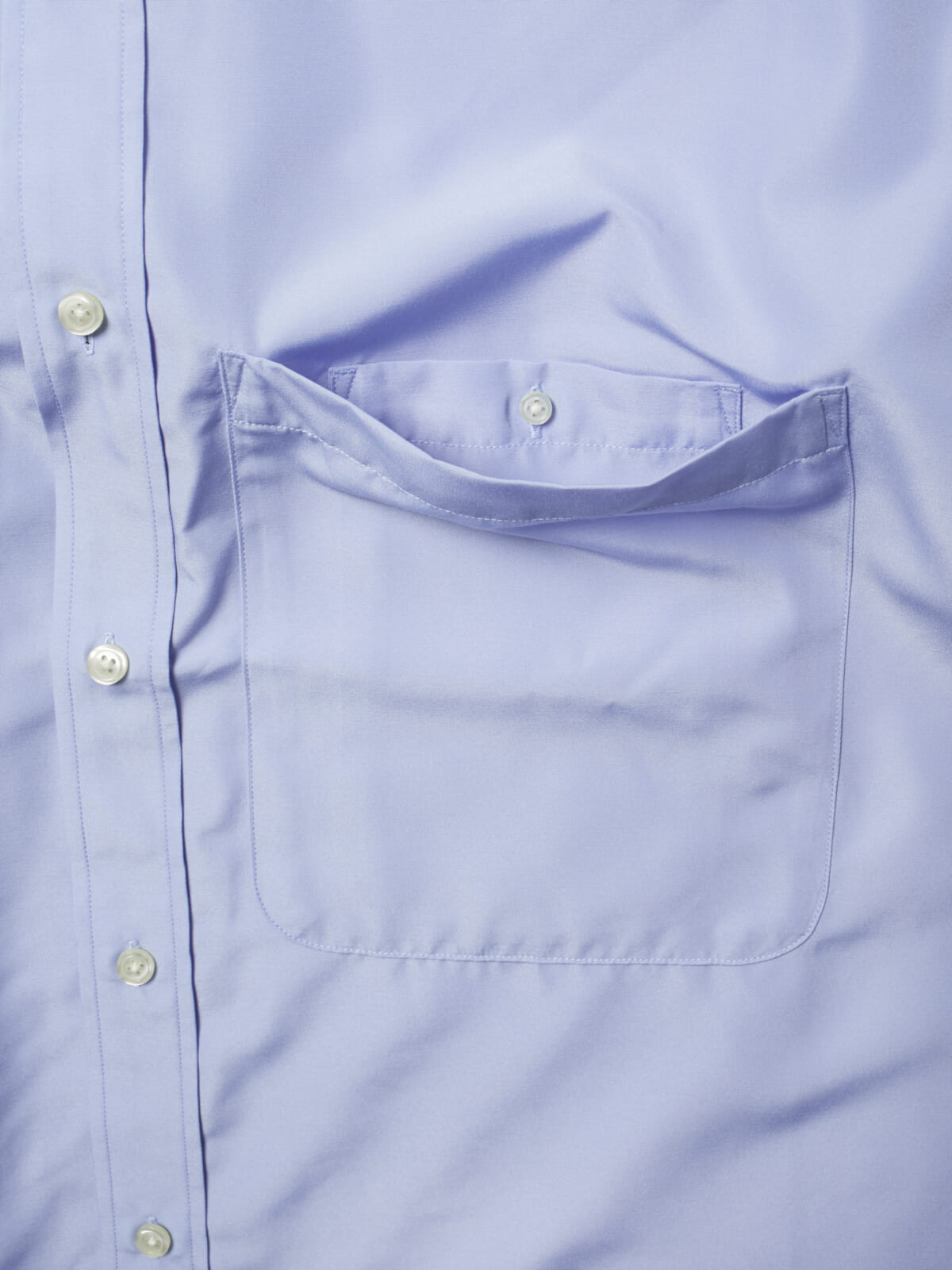 極めてベーシックな平織のコットンブロード地をポリエステル100%にて再現したオーバーサイズのボタンダウンシャツ。軽量でシワになりにくくアイロンいらずです。また、大きくデザインした胸のパッチポケットの中に小さなモバイルポケットを配し、シンプルながらも使いやすいこだわりが詰まっています。ブルーストライプとサックスカラーの2色展開。