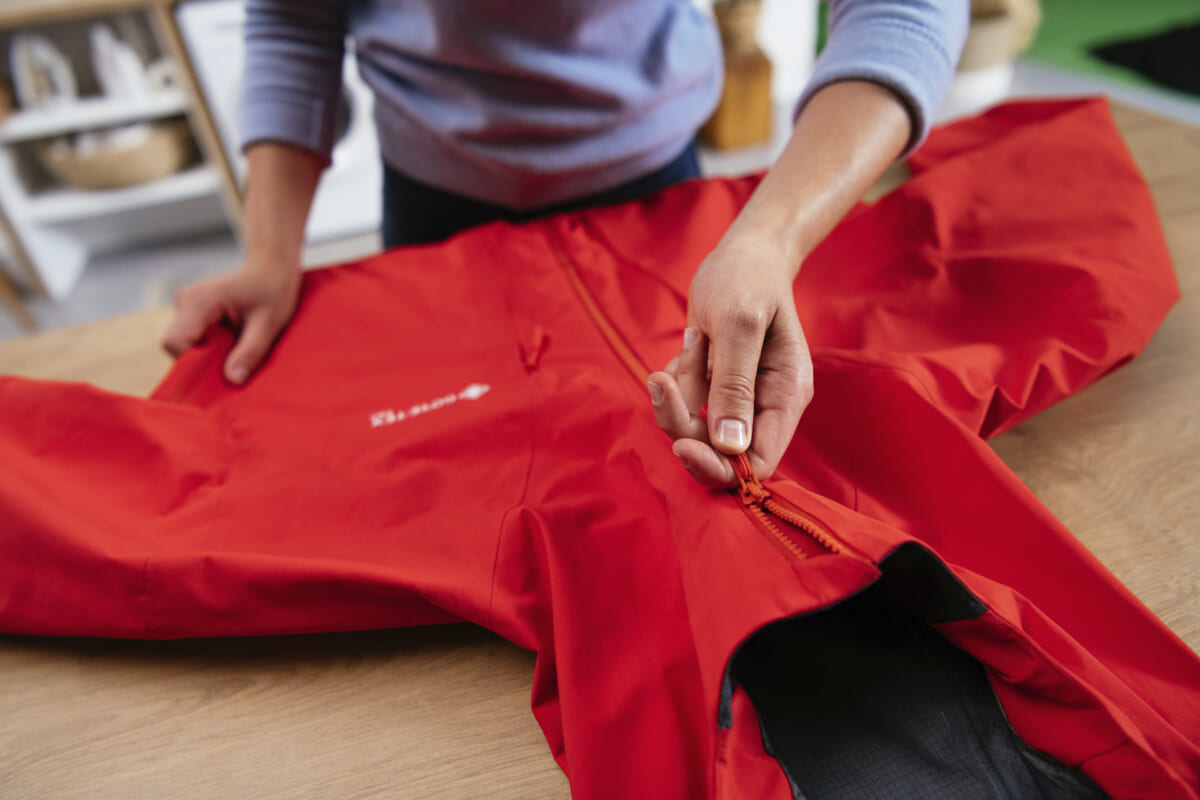 伊藤 まずは、製品についている洗濯タグを必ず確認して、その内容に従って洗濯してください。アウターウェアによって表生地・裏地に使われている素材が異なるため、洗濯・乾燥方法が異なる場合があります。次に、全てのファスナー、面ファスナーを閉じ、ポケットも閉じたら、軽く畳んで洗濯ネットに入れて洗濯機へ。液体の中性洗剤を少なめに入れて40℃以下のぬるま湯で洗濯してください。粉末洗剤は洗剤成分が残りやすいので使用は避けます。漂白剤はもちろん、しみ抜き剤も生地を痛めますので使用は避けましょう。液体洗剤でも香り成分の強い種類も避けてください。洗濯後に香りが残るというのは、その成分が生地の表面に残っているということなので、これが撥水性を低下させる可能性があるからです。