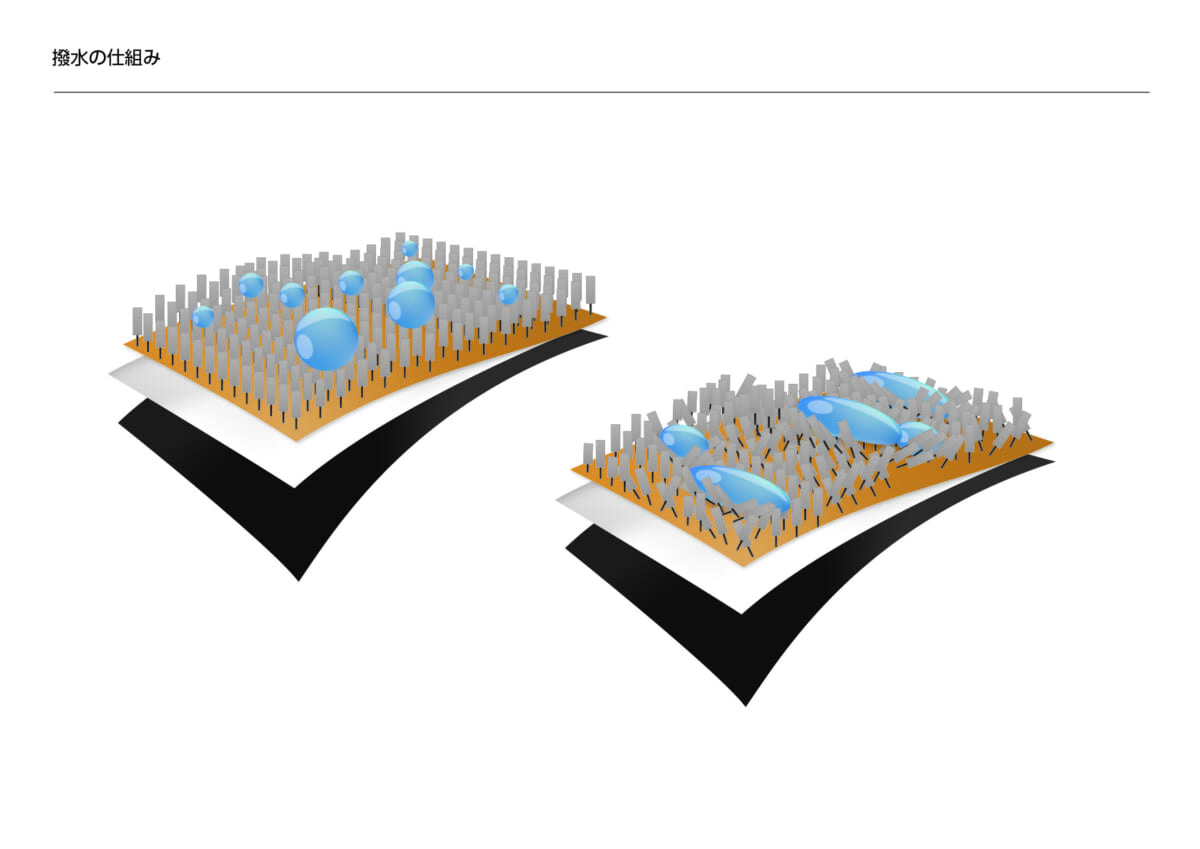 伊藤 はい、ほとんどの製品は家庭で洗うことができます。製品本来の機能を保つためにも、むしろ積極的に洗ってください。GORE-TEX製品は「GORE-TEXメンブレン」という薄いフィルム状の生地を挟んだ3層構造になっているのですが、表生地には撥水基と呼ばれる柱のようなものが直立して並んでいます。水滴よりも小さいこの柱が水を弾くのですが、汚れが付着すると撥水基が倒れてしまい、生地に水が浸透してしまうのです。雨や泥汚れだけでなく、キャンプの煙、お化粧や日焼け止め、自分の汗や皮脂が付着しても撥水性は損なわれてしまいます。こうした汚れを洗濯で落とすことにより、撥水基が再度直立し、水を弾いてくれるのです。また、裏地に汗や皮脂がたまると、生地の縫い目に貼ってある防水シームテープが剥がれやすくなってしまいます。ですから、着るたびに洗濯することをオススメします。