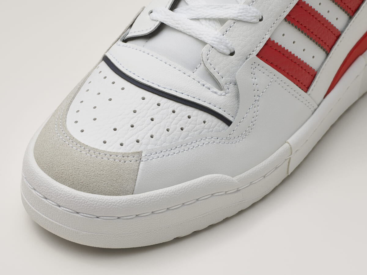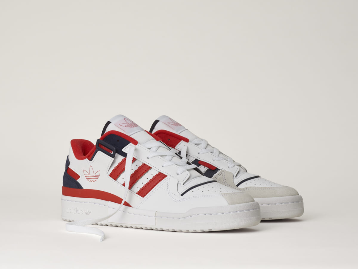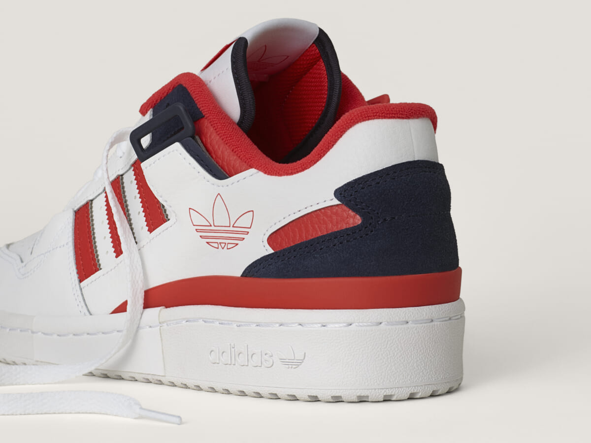 今シーズンのフォーラムは、これまでの伝統を生かしながら新しい要素を取り入れることで、個性的なルックに生まれ変わりました。「FORUM EXHIBIT LOW」は、取り外し可能なストラップ、レッドとネイビーブルーのディテールが施された高級感あるホワイトレザーのアッパーが特徴で、ロープロファイルなデザインにまとめています。