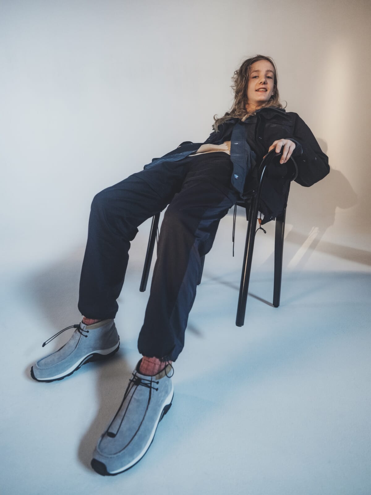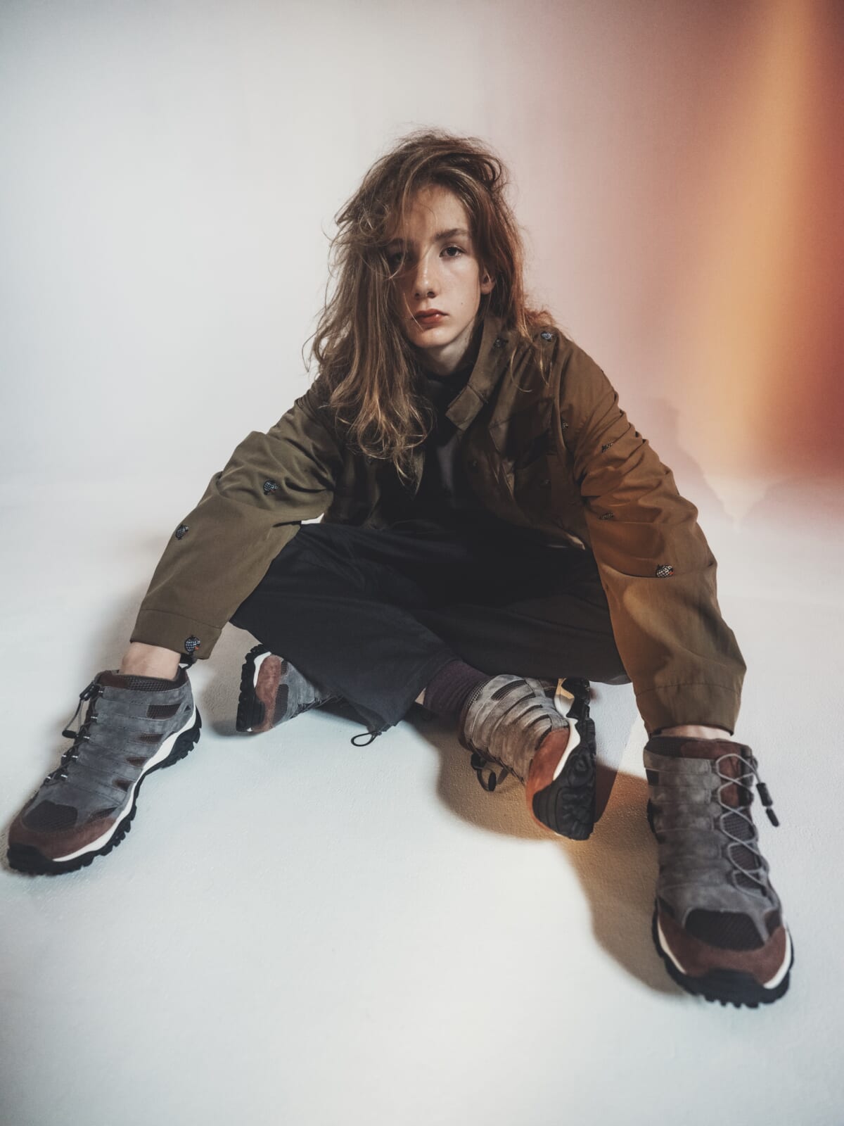 今回の新作はそれぞれ、メレルの伝統的なアイコンシューズに倉石氏独自のデザインが落とし込まれています。「メレル × エー・フォー モアブ」はクラシックなモアブのシルエットをチャッカのシューズ高に再構築することでデザインを刷新し、アシンメトリーのシューレースシステムを採用。