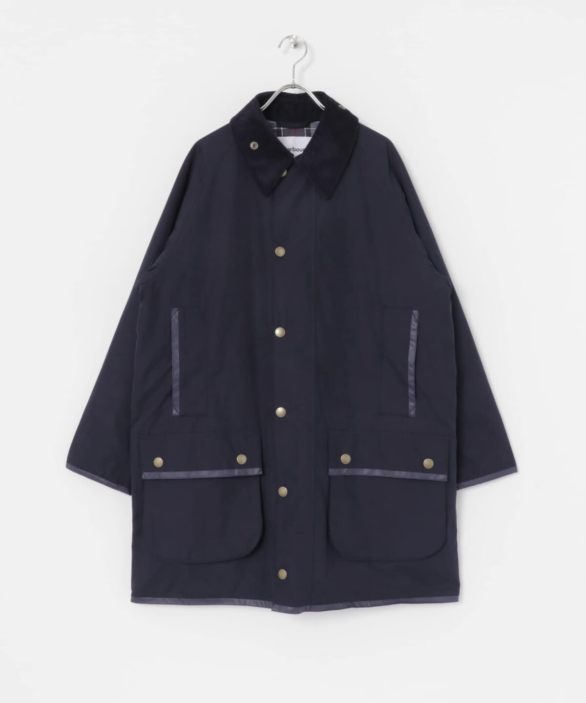 襟のコーデュロイの切り替えやハンドウォーマーポケット・フラップポケットの仕様など、バブアーらしいディテールを踏襲しつつ各所に施されたパイピングがアクセントに。表地は起毛感があり、ワックスドコットンのような風合いを持ったピーチスキンを使用することで、見た目の重さを軽減しつつ、ミニマルな表情を演出しています。