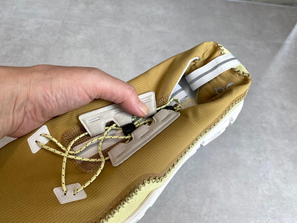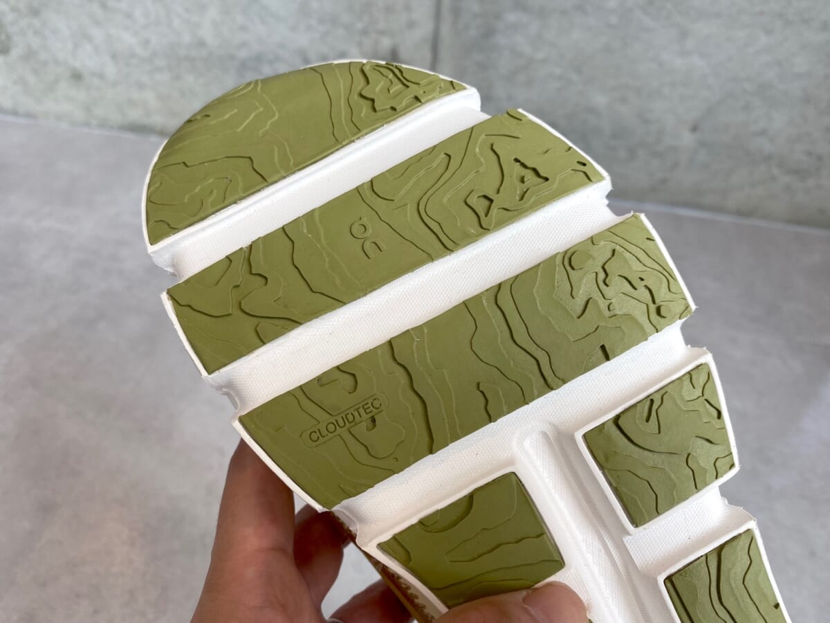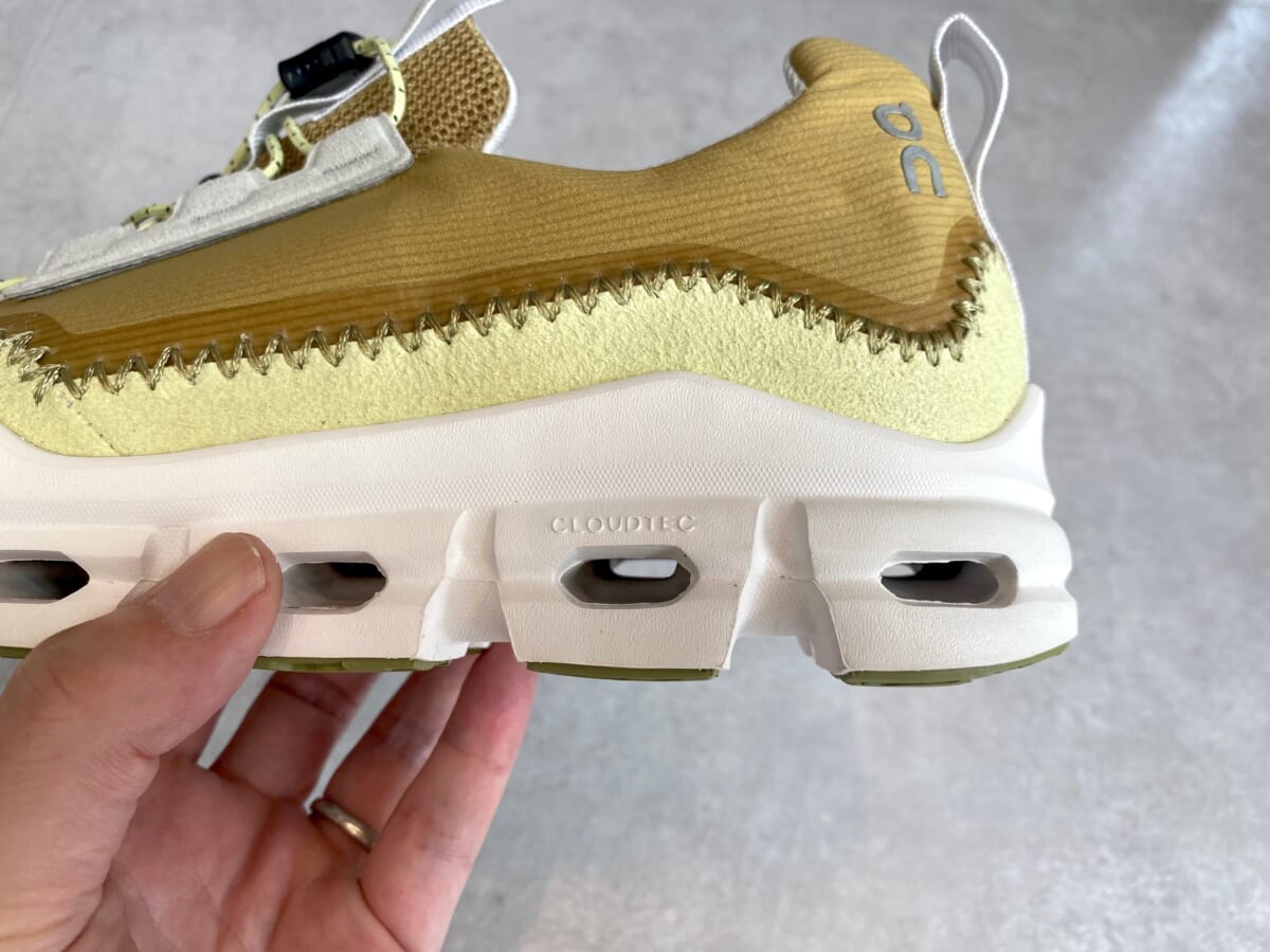 クラウドアウェイのアッパーはメッシュとビーガンスエードのコンビネーション、サイドにはモカシンステッチを施し、とてもカジュアルな印象に仕上がっています。ソールはもちろん世界特許技術を搭載して、優れたクッショニングを提供してくれます。さらにOn独自の足形プレートを内蔵して、蹴り出し時に優れた反発性を発揮。カジュアルなルックスと高機能がバッチリと融合しているわけです。