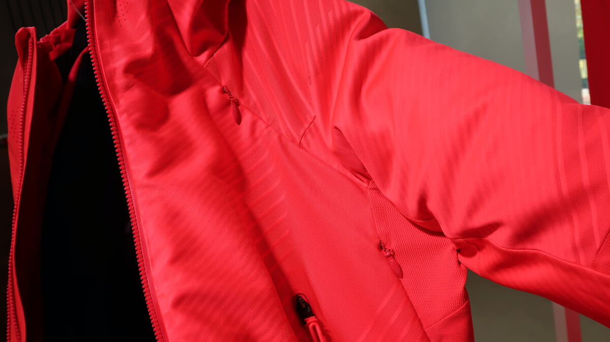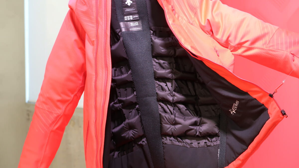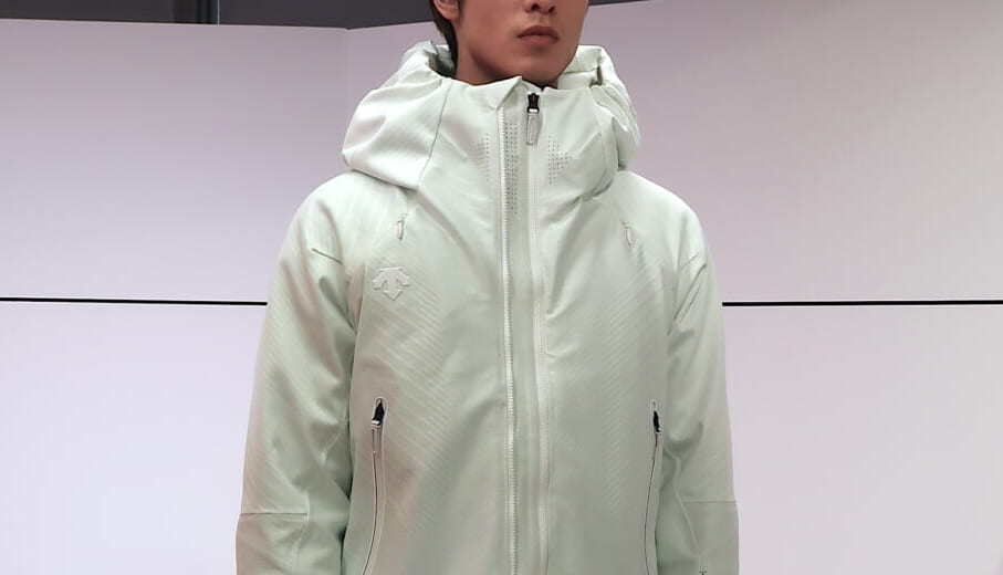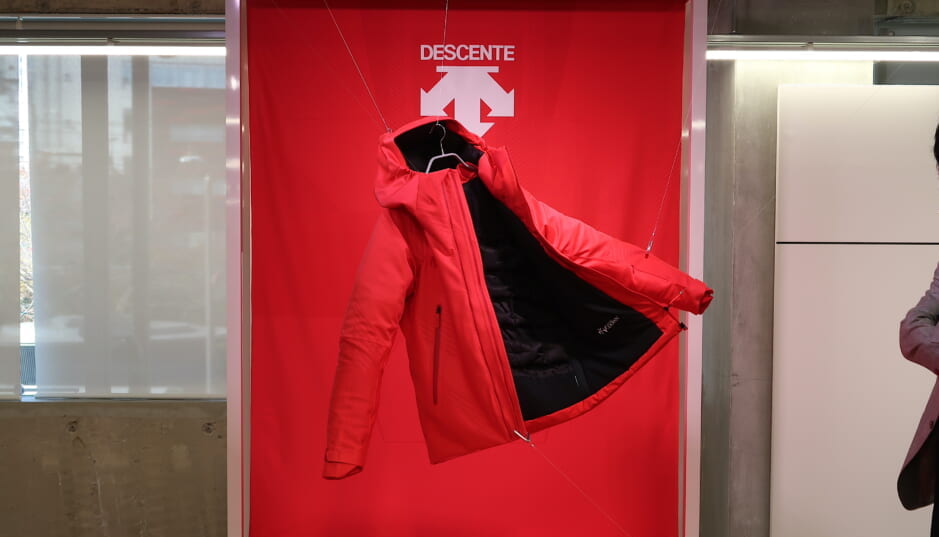 発表会当日、デサント 水沢ダウンジャケット “アルパイン”の特徴をデサントジャパン商品企画の橋本氏はこう語りました。「当社の開発拠点である『DISC(デサント・イノベーション・スタジオ・コンプレックス)』で開発、テストを実施した商品です。皮膚を持つウェアとして、選手のパフォーマンスを引き出すための素材“スキーマテック スカイ”。そして、呼吸をするウェアでもあり、選手のパフォーマンスを引き出すためのディテール“3Dインシュレーター システム”を新機能として搭載しています」と。