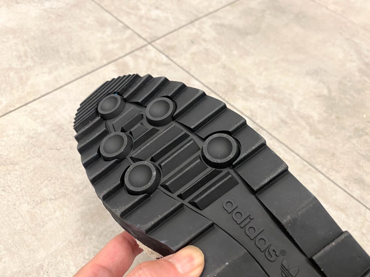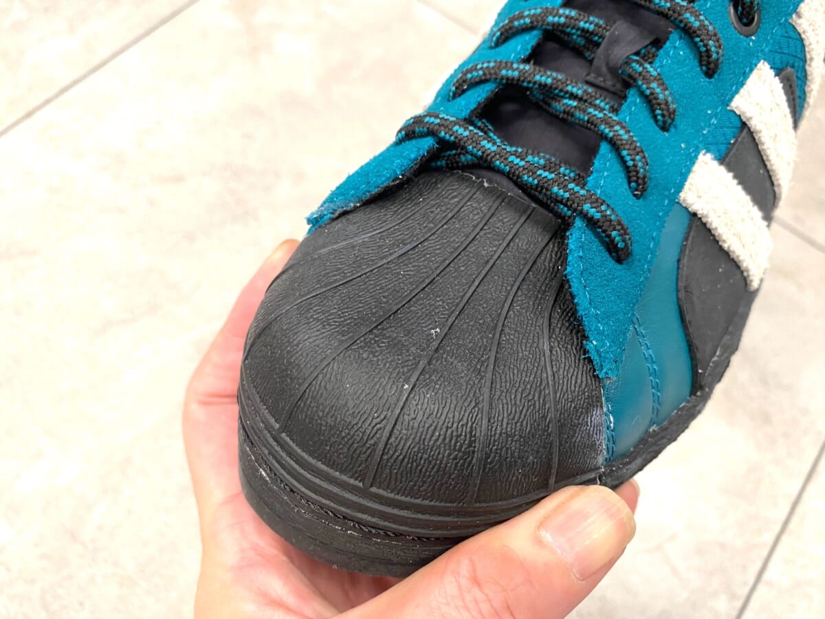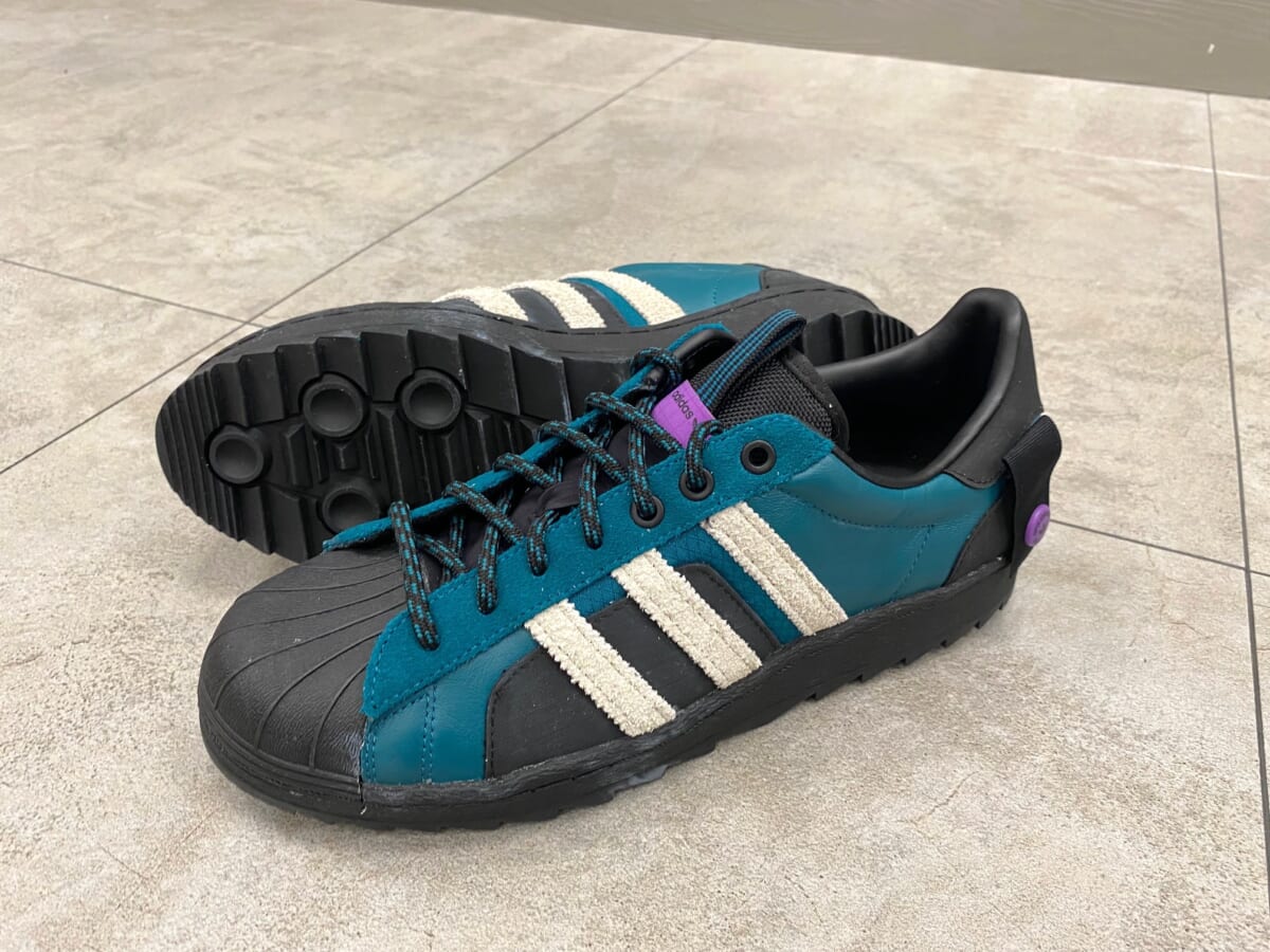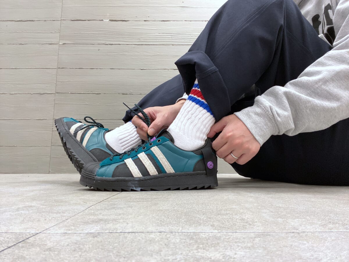 アッパーはボリューム感あるフォルムにシャルトゥ&スリーストライプスなど、いつものスーパースターそのものですね。しかし本作では、アッパーを構成する要素の25%にリサイクル素材を使用。そして、凹凸のメリハリを効かせたラグソールと補強のラバーを備えて、地球環境への考慮、プラス耐久性がアップしています。
