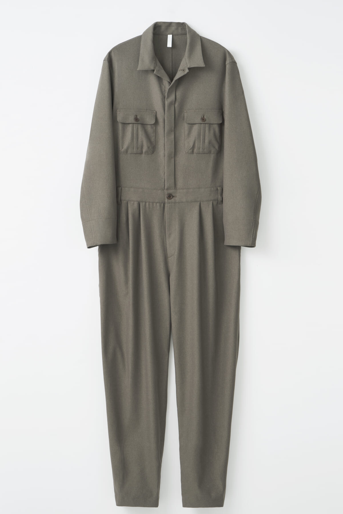 一見ルーズに見えがちな「ジャンプスーツ」を上品にテーラリング。トップは適度なフィットでボトムは動きやすくゆとりのあるシルエットのアンプルライン。フロントは比翼仕立てでシャープで上品なジャンプスーツになっています。