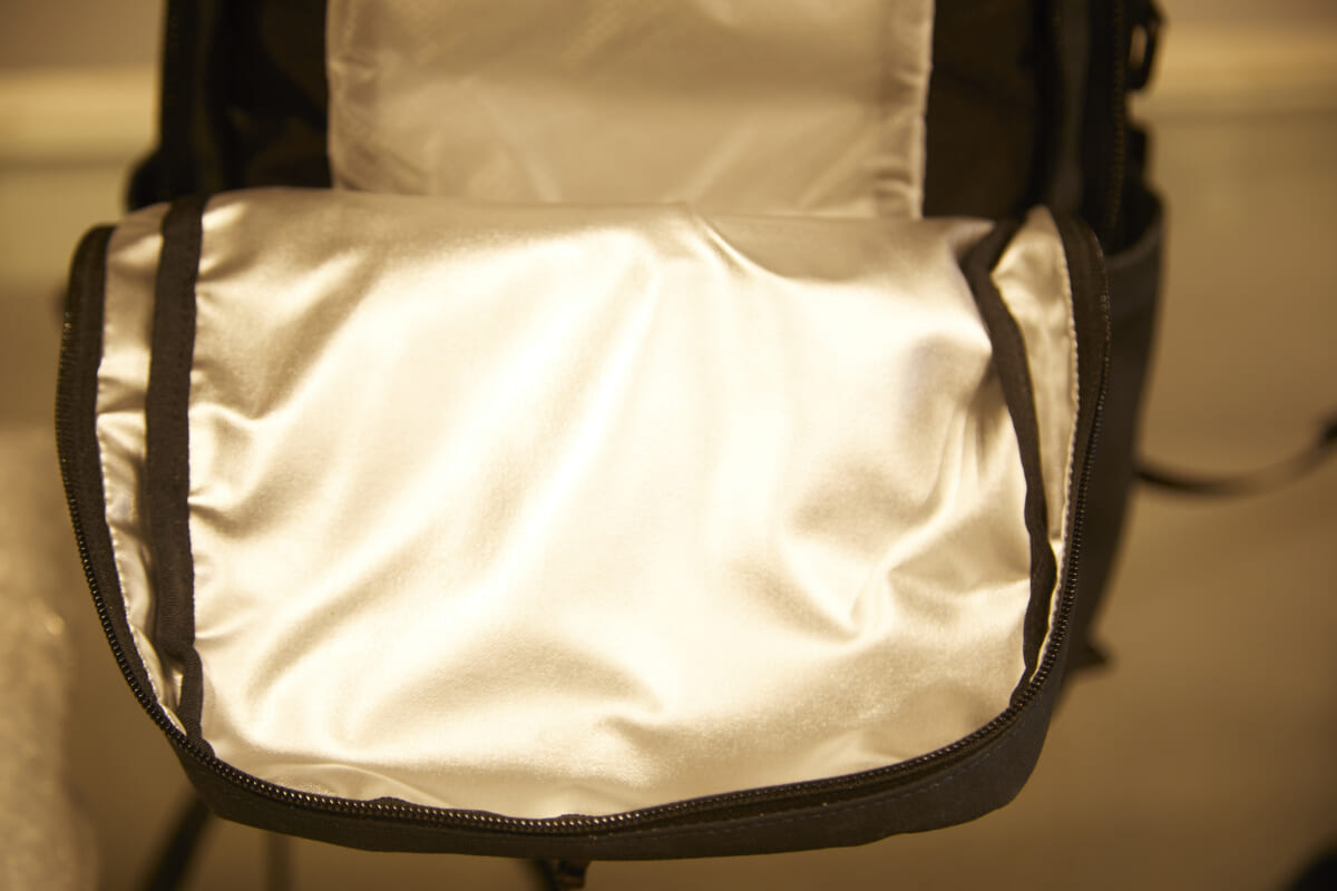 「platoon」シリーズは、難燃配合のクロロプレーンゴムを施した生地の表面にアルミをコーティングした難燃仕様。フロントにあしらわれているリフレクトテープは、雨などの水分が付着してもしっかりと反射。ファスナーのパーツはホイッスル機能を有しているので、いざという時に活躍します。そんな高い機能性を持ちながら、シルバーでまとめた見た目はコーディネートのアクセントに最適。日常で使えば、日頃から防災意識を高められるのではないでしょうか。