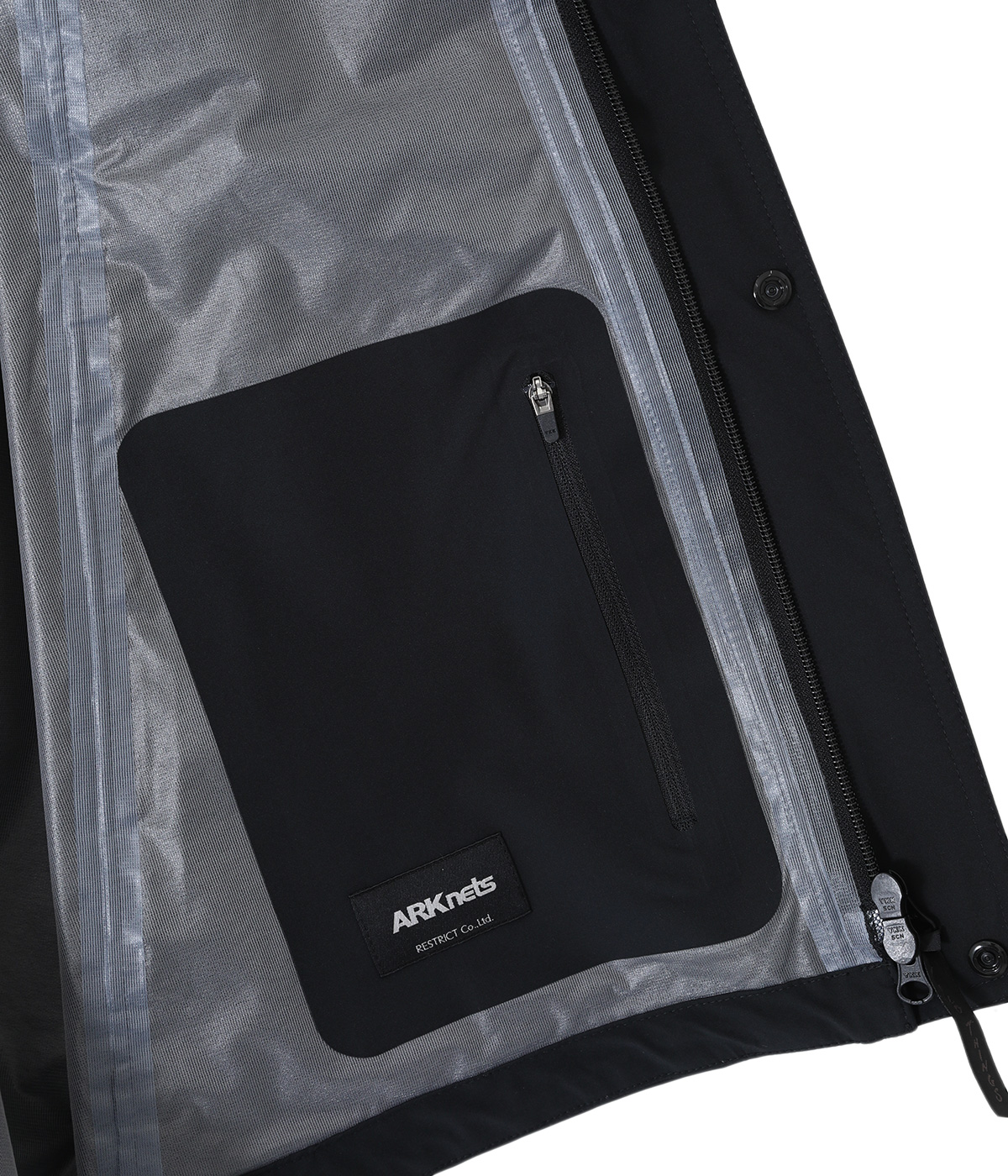 なおベースモデルに存在する襟部分の収納可能なフードは取り払い、首元をスッキリさせるとともに軽量化を実現しています。ゆったりとしたシルエットは、裾に設けられたスピンドルで調整することでシルエットの変化も可能。左内側腰部分に内ポケット1つを備えています。