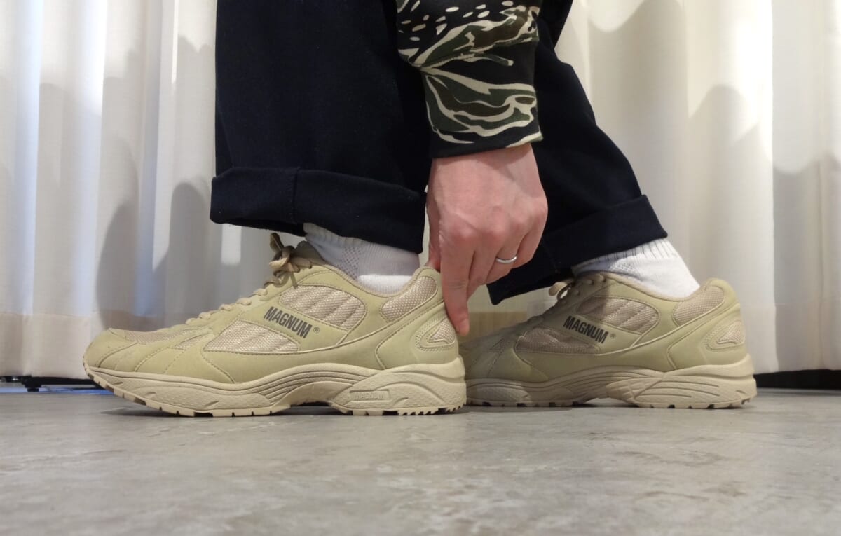 今回紹介するのが、現代のハイテックの代名詞的モデル「マグナム U.S.T」。軽量で高機能、かつ快適なトレーニングシューズを求めるイギリス軍の基準に基づいて、2013年に開発された力作です。現在も新兵全員が基本訓練用のユニフォームとして着用しているモデル。優れた通気性を確保したアッパーと、ビブラムソールを組み合わせたタフ仕様モデルながら、全体を1トーンカラーでまとめたノームコアなルックスで、ストリートにもバッチリ調和します!