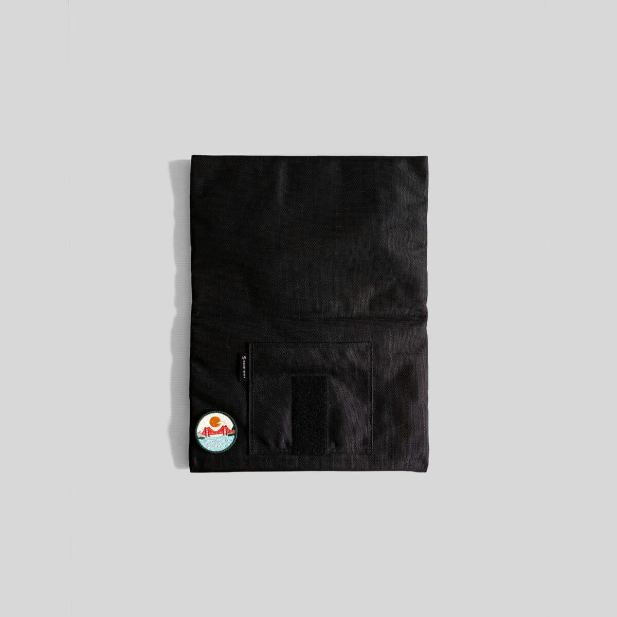 13インチのMacBook Proがちょうど収納でき、着脱できる刺繍ワッペンやmaster-pieceカラーのイエローステッチ、内装に使用したシルバーのターポリンがデザインのアクセントです。フロントのテープ裏には面ファスナーがついているので、クルクルっと巻き、形状をアレンジして使用することも可能なPCスリーブ。