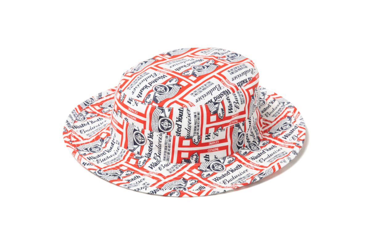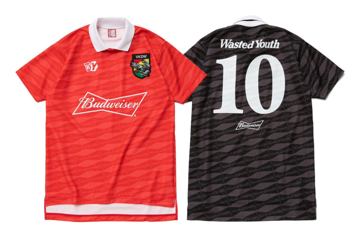 今回初となるBudweiserとのオフィシャルコラボレーションは、VERDYが以前からリリースを熱望していたアイテムを中心にラインナップされています。架空のサッカーチームのユニフォームをコンセプトにしたサッカーシャツ、古着のような”マーチ風”ラベル総柄デザインのハットやショーツ、さらにはBudweiserのコラボ缶を忠実に原寸大で再現した張り子細工など、Wasted Youthらしいユーモアのあるコレクションとなっています。