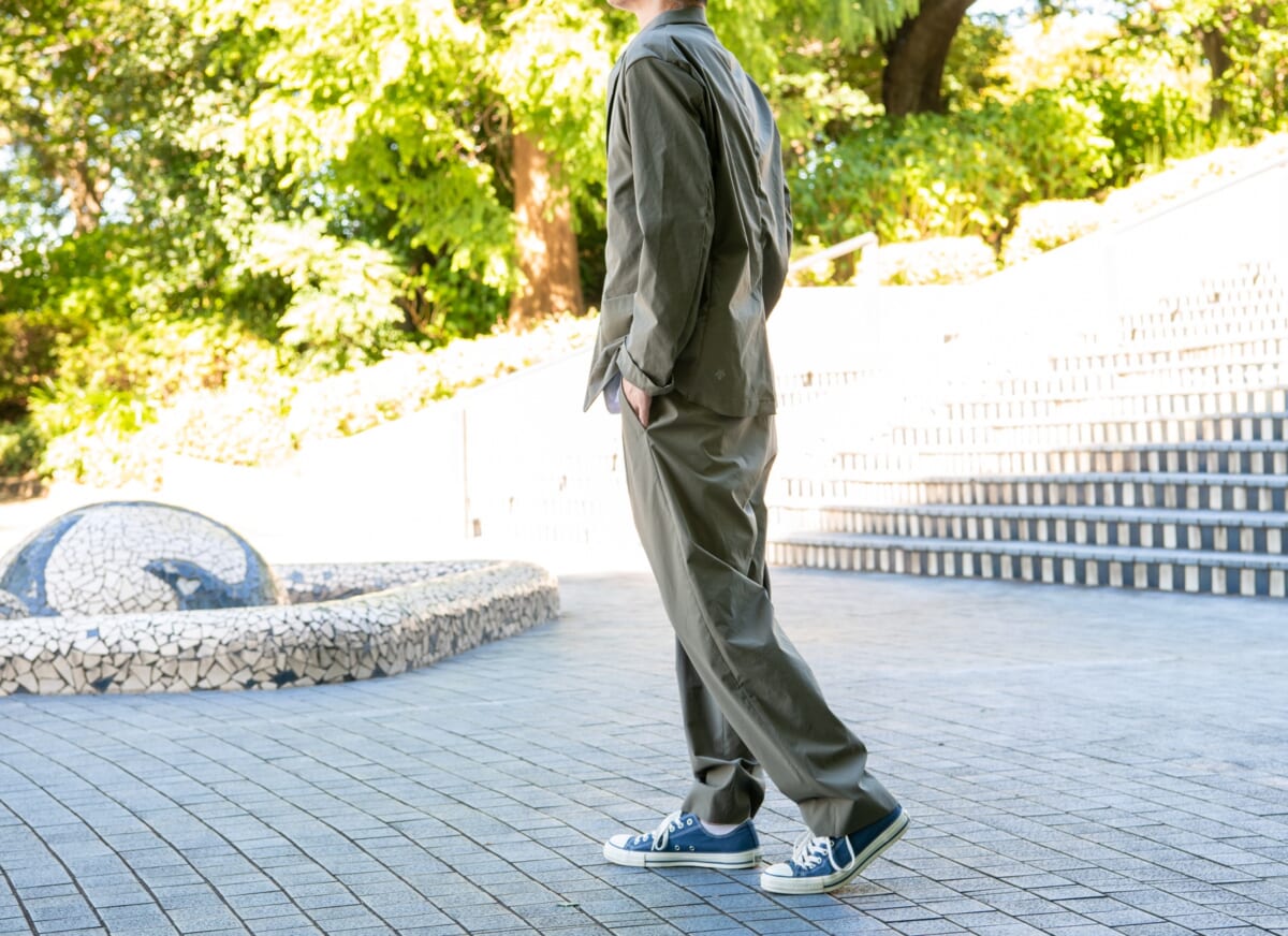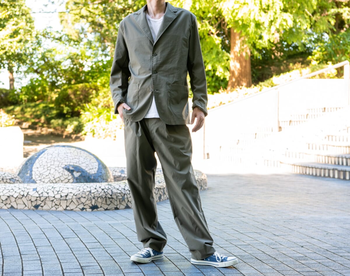 リラックス感あふれるシルエットと着心地がたまりませんね。だけど、どことなくピシッとした気分になるのは、不思議です。セットアップ効果と言えるものなのでしょうか。もちろん、セットアップを着ているような締め付け感とは無縁で、普段のカジュアルスタイルと変わらずノンストレス。オンとオフを問わずにボーダレスで活躍してくれるので、ここ最近のビジカジにもピッタリですね!