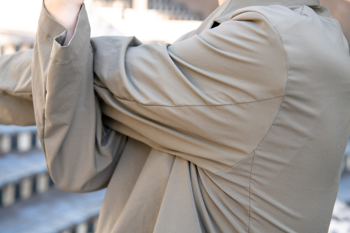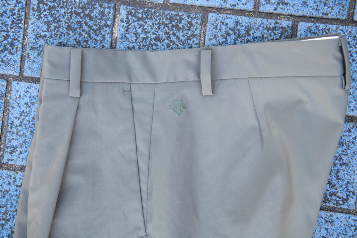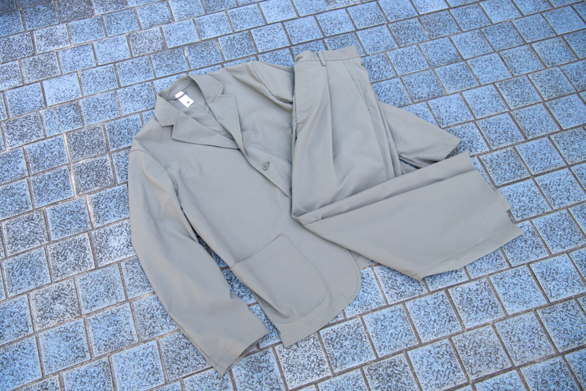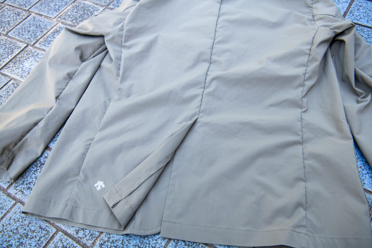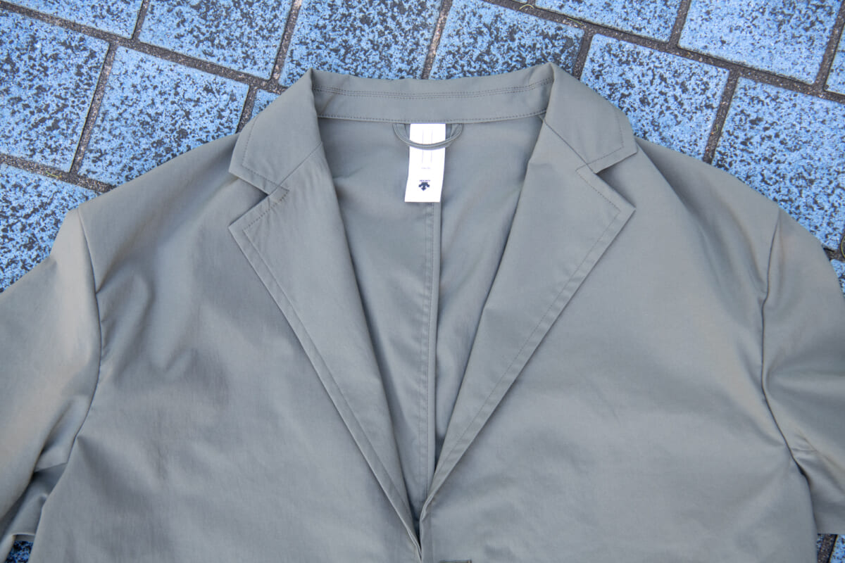 こちらがデサントポーズの新作のテーラードジャケットと、スラックスによるセットアップです。生地は共に撥水効果のあるストレッチ素材を使用していて、高い伸縮性で身体の動きを邪魔しません。シルエットは若干ゆとりのあるリラックス仕様で、今どき感と小慣れ感が溢れますね。そして何よりも、軽量で動きやすい! さすがはデサントが手がけるウエアだけあって、1ランク上の着心地となっています。