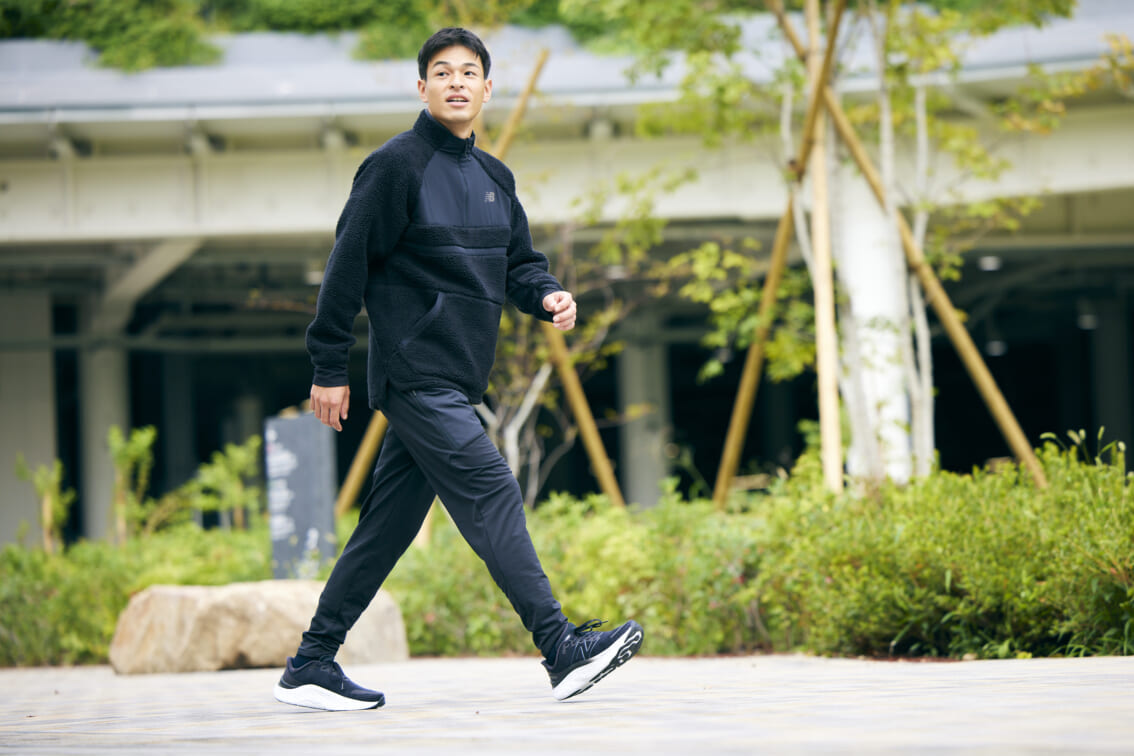 「まず最初に驚いたのが、そのソフトな履き心地。膝や腰に負担がかからない、クッション性はFresh Foam X ミッドソールを採用しているランニングシューズだからこその快適感です。そして、爪先と踵が大きく巻き上がっている独特な形状のボトムのおかげか、軽くウォーキングをしているだけでも『スッ』と足が前に進むような推進力を実感することができます。