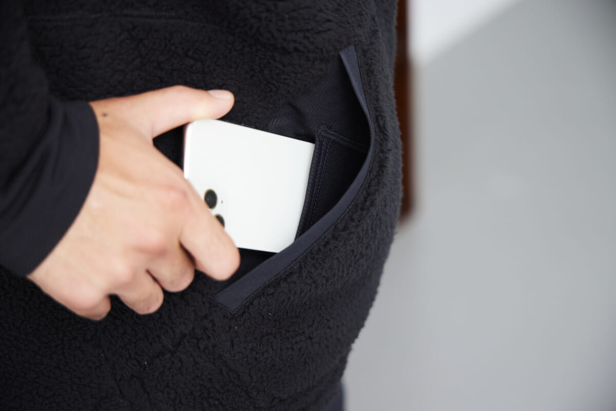 ランニング中の音楽視聴や出先でのちょっとした買い物の際など、今やトレーニング中にも欠かすことのできないスマートフォン。Q Speed シェルパ アノラックのカンガルーポケット内部には、スマートフォンを単独で収納できるポケットインポケットが採用されているため、ランニング中の振動で落としてしまう心配もありません。