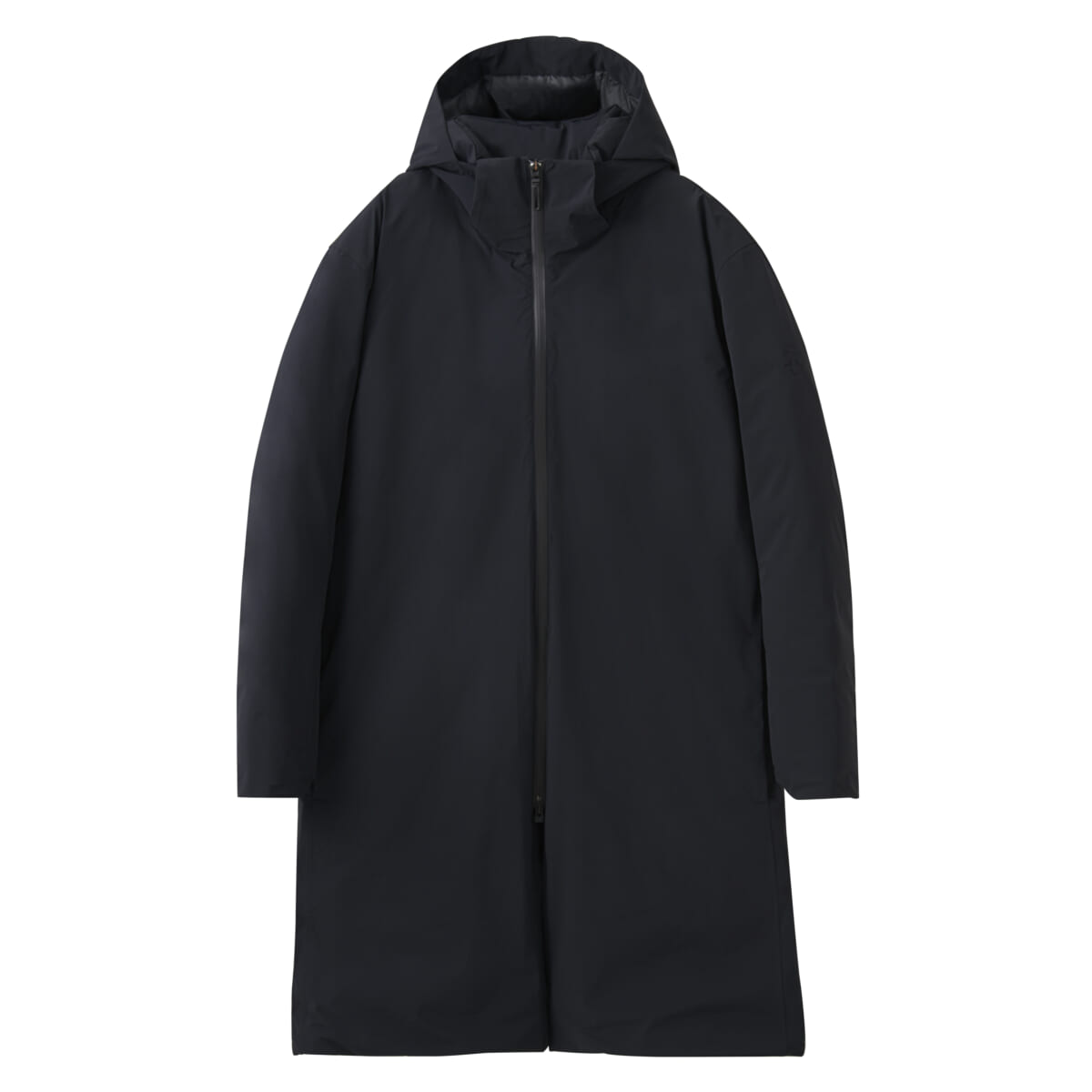 水沢ダウンの特徴である高い防水性と保温性はそのままに、熱接着ノンキルト加工やその他ディテールを全てプロダクトの内側に潜め、より都会的でミニマルなデザインを実現したロングコート。ダウン量を従来の約60%に調整し、より軽やかな着心地を追求した軽量モデルです。