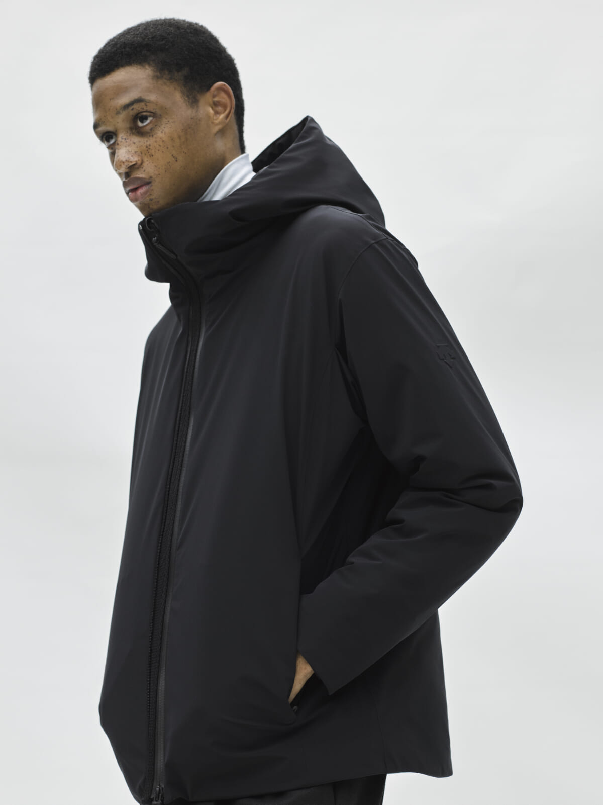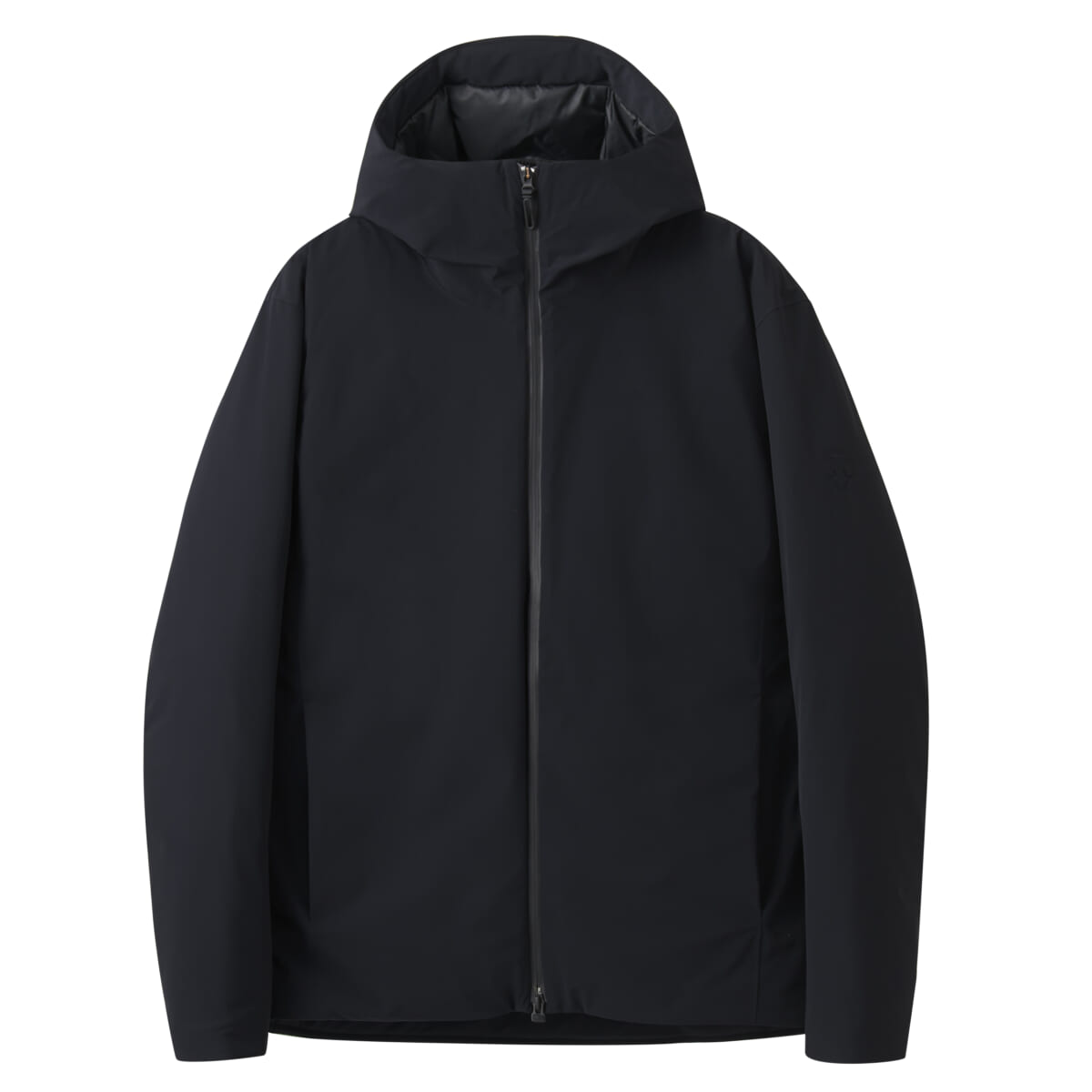 水沢ダウンの特徴である高い防水性と保温性はそのままに、熱接着ノンキルト加工やその他ディテールを全てプロダクトの内側に潜め、より都会的でミニマルなデザインを実現したフードジャケット。ダウン量を従来の約60%に調整し、より軽やかな着心地を追求した軽量モデルです。