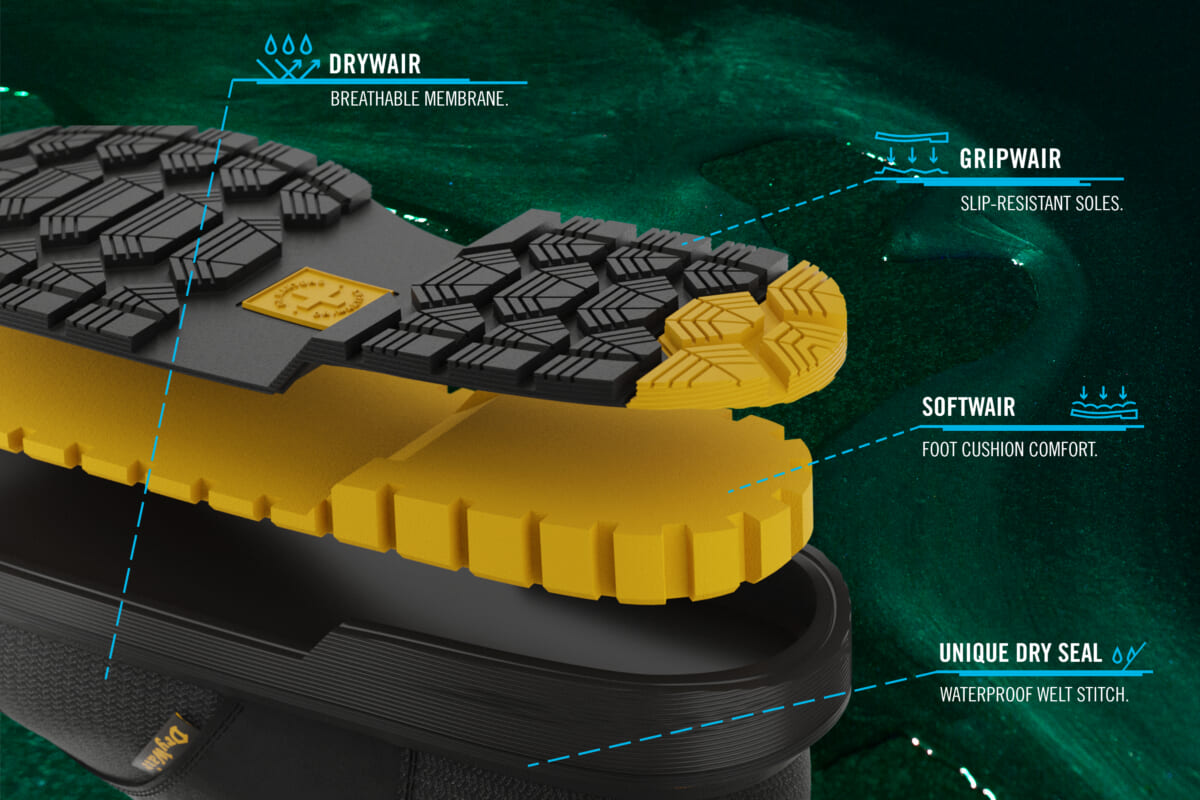 透湿性のある「DryWair」防水膜のアッパーにカヤヌバックレザーを使用し、ムレを防ぎながら、独自の「Unique Dry Seal」防水イエローステッチウェルトで固定し、外からの水の進入を防ぎます。フリース素材の「WarmWair」ライニングは、保温性があり、熱を逃がしません。
