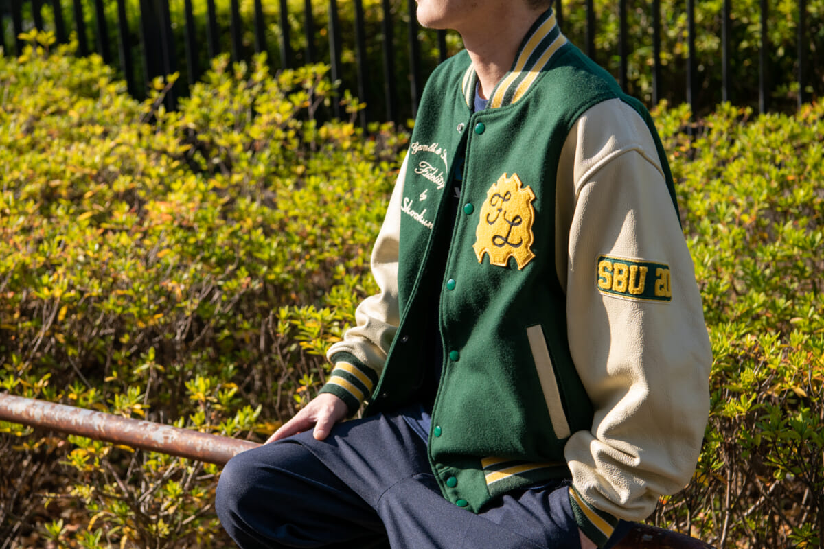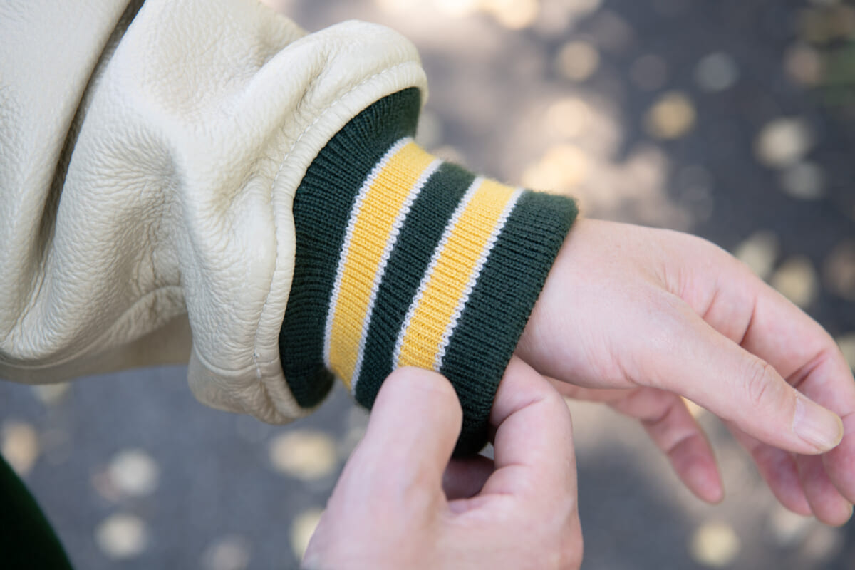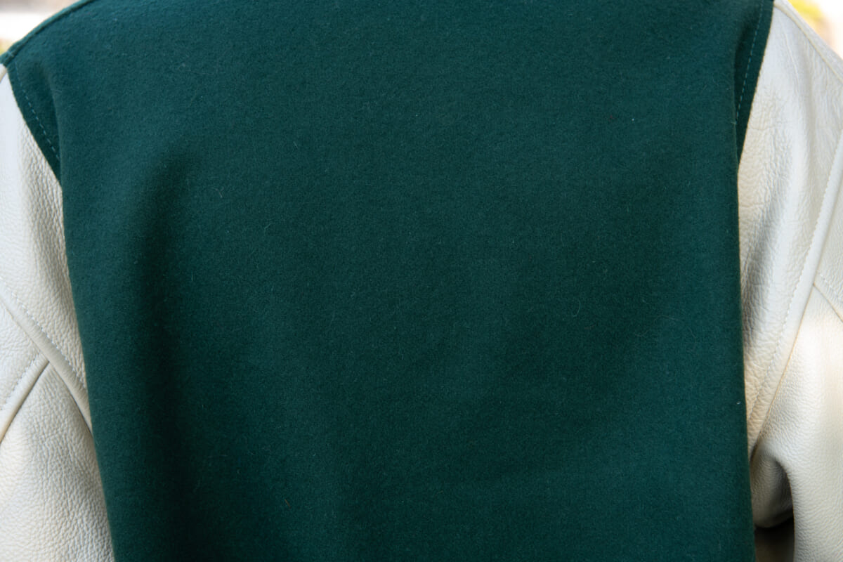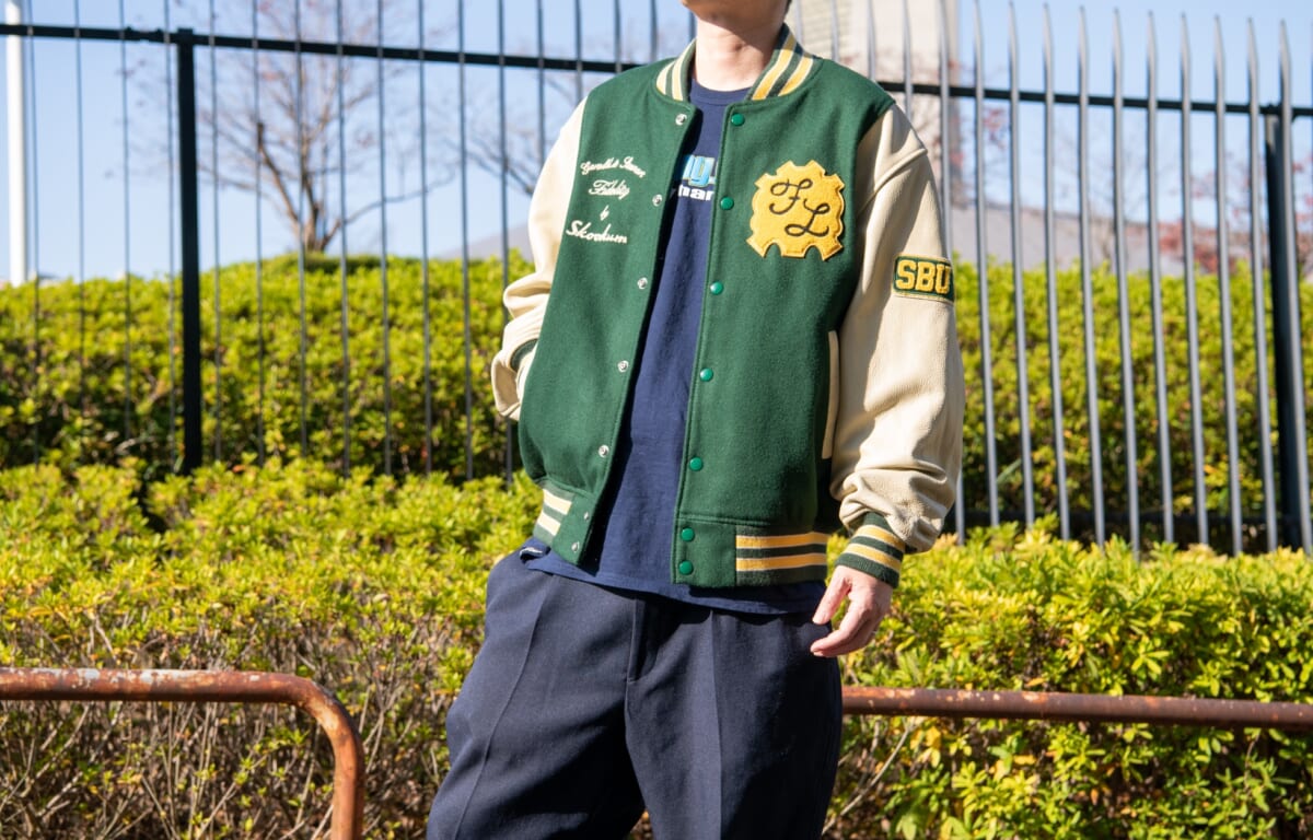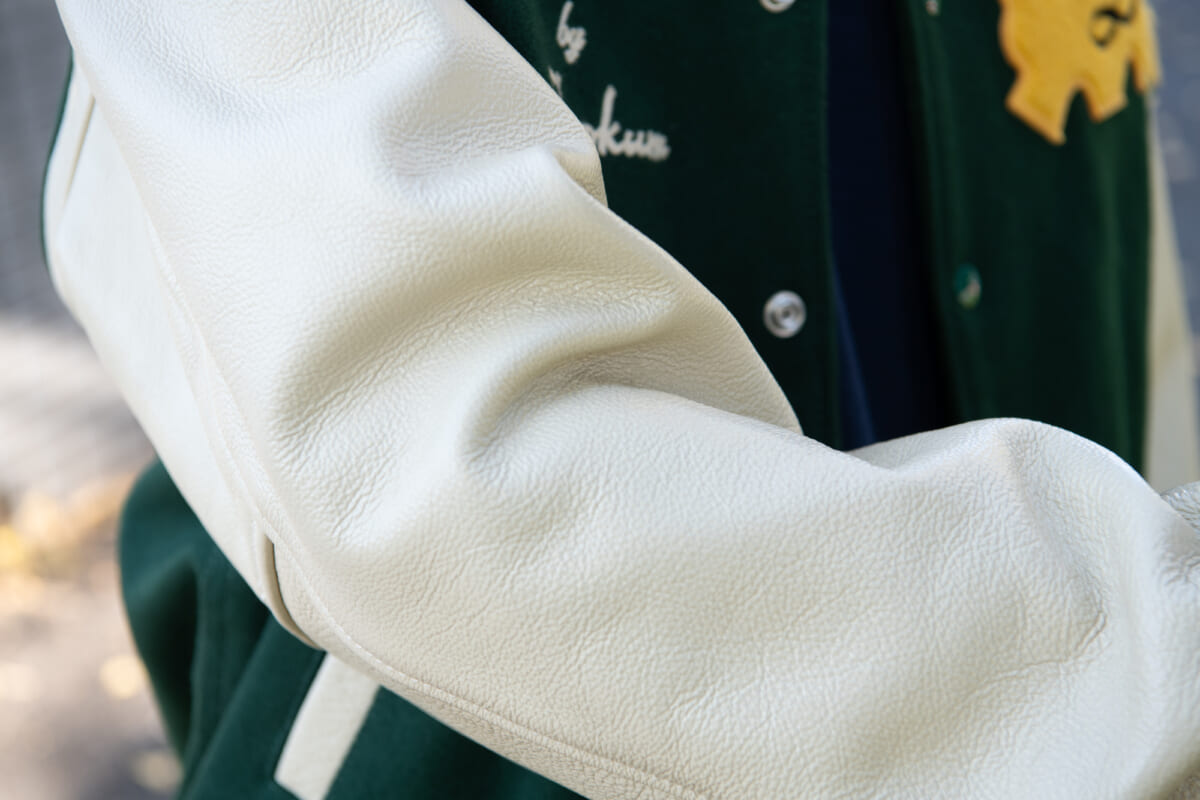 ベースとなっているのは、スクーカムの代表的モデルであるスタジアムジャンパー。ボディは昔ながらのウール混率90%のメルトン生地、アームにはカウレザーを使用し、高級感のあるルックスに。クラシックな仕様のスタジャンだと小さめなイメージですが、本作は身幅をワイドにし、モダンなシルエットへと仕上げられています。