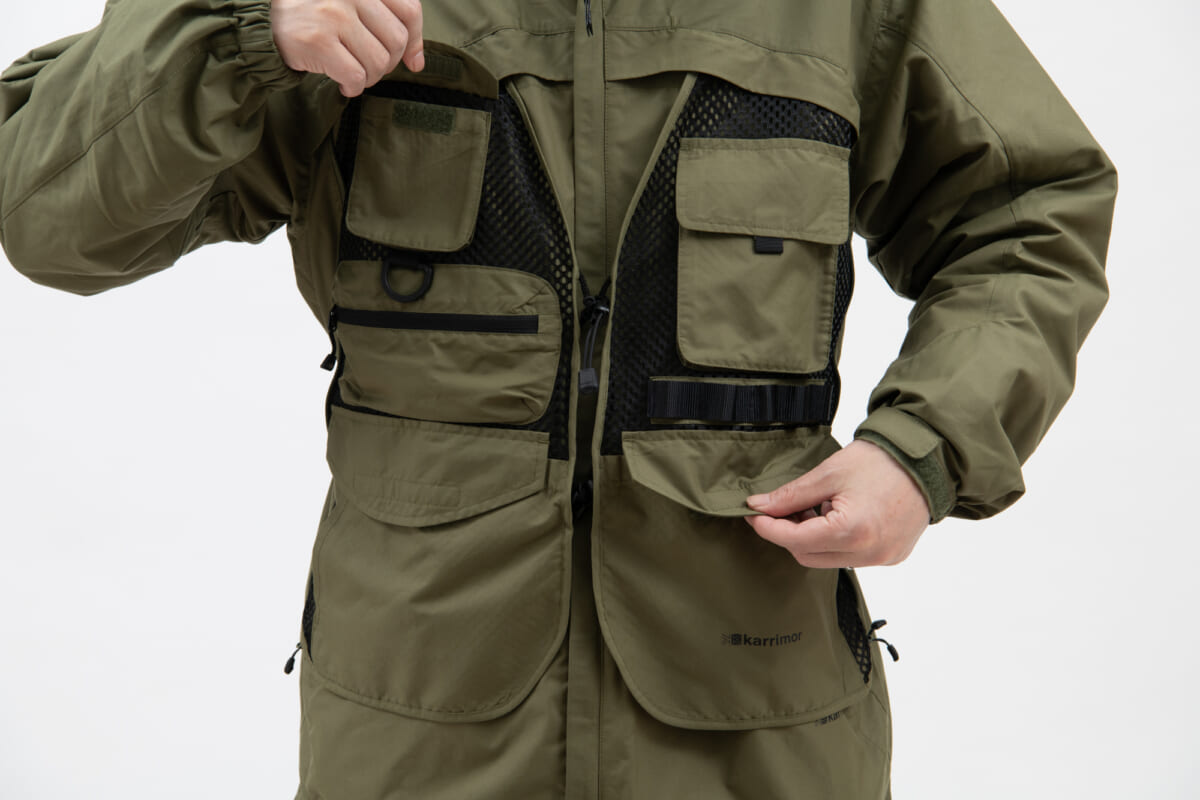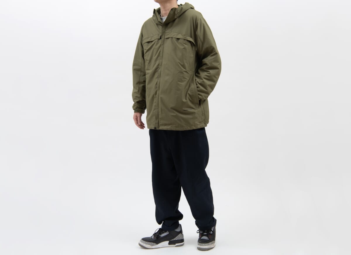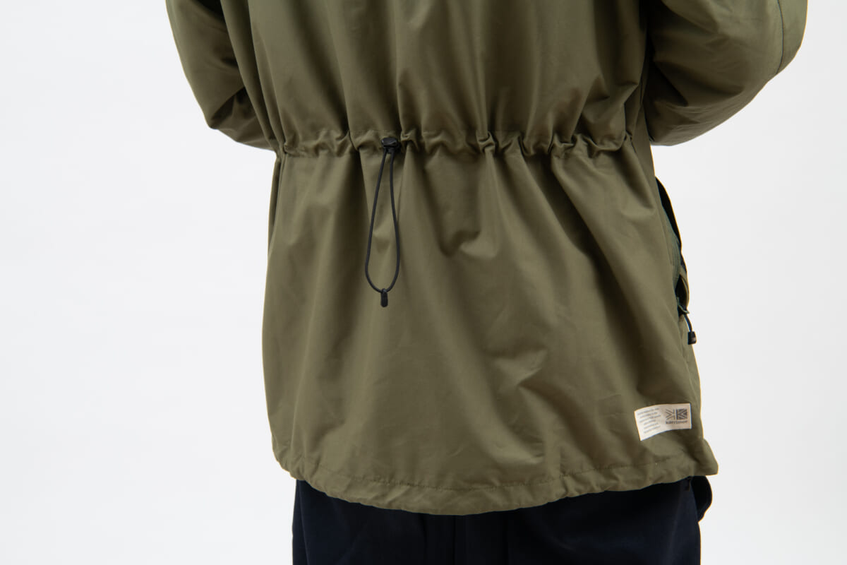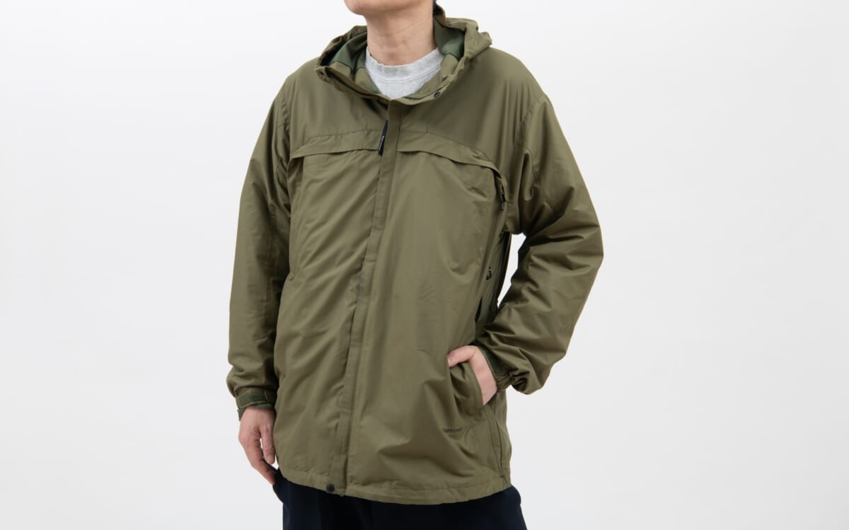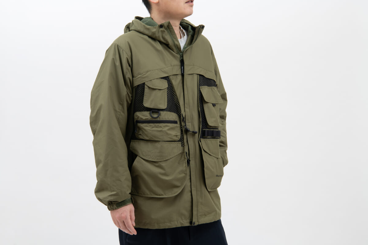 本作は、シンプルなマウンテンパーカと多収納ベストジャケットを、1着で2役をこなすトランスフォームジャケット。どういうギミックかというと、マウンテンパーカ表地の下にベスト部分が内蔵されていて、ベストジャケットにしたい時はベスト部分をフロントに出し、マウンテンパーカ表地をベスト下に格納すれば多収納ベストジャケットの完成です。