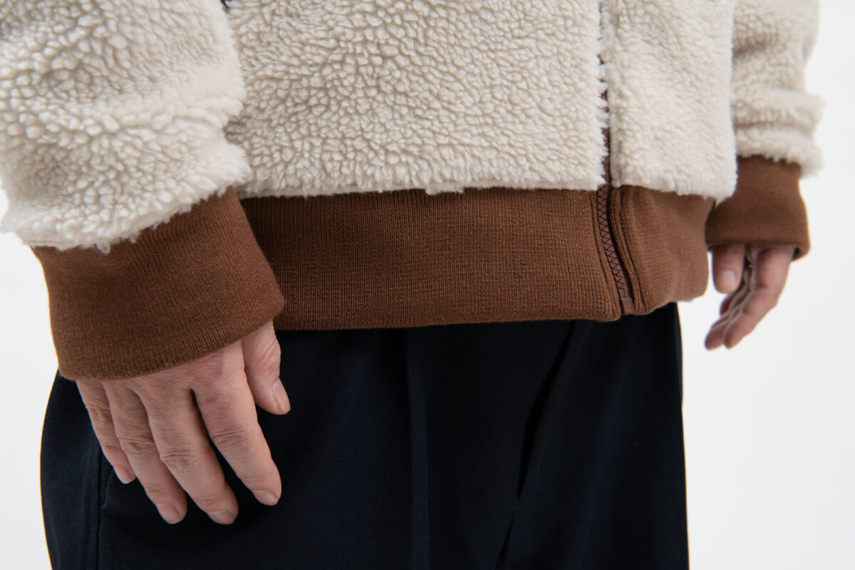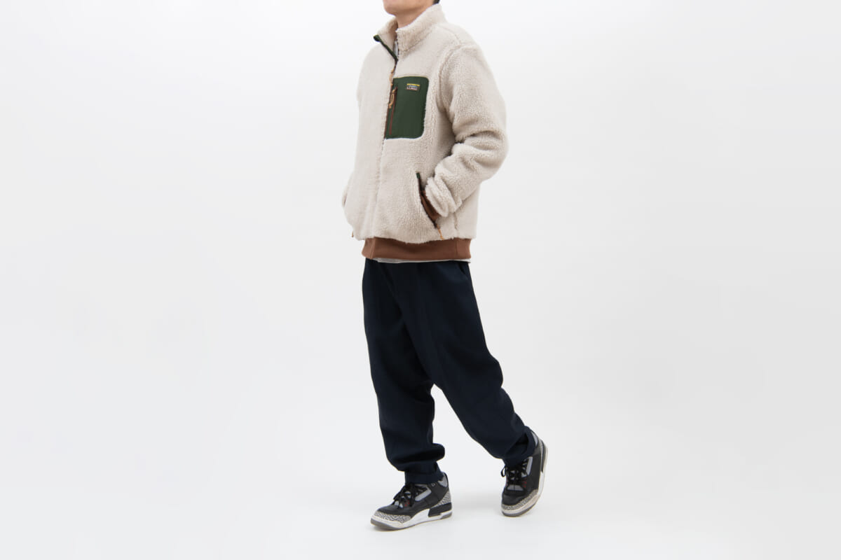 ボディ生地は毛足が長くソフトで暖かなシェルパ・フリースを使用していて、保温性が抜群ですね。コレ一枚をアウターとして着用することはもちろん、ミッドレイヤーとしてもバッチリ。ちなみに、洗濯機で丸洗いもOK! とても便利で賢い一着かと思います。