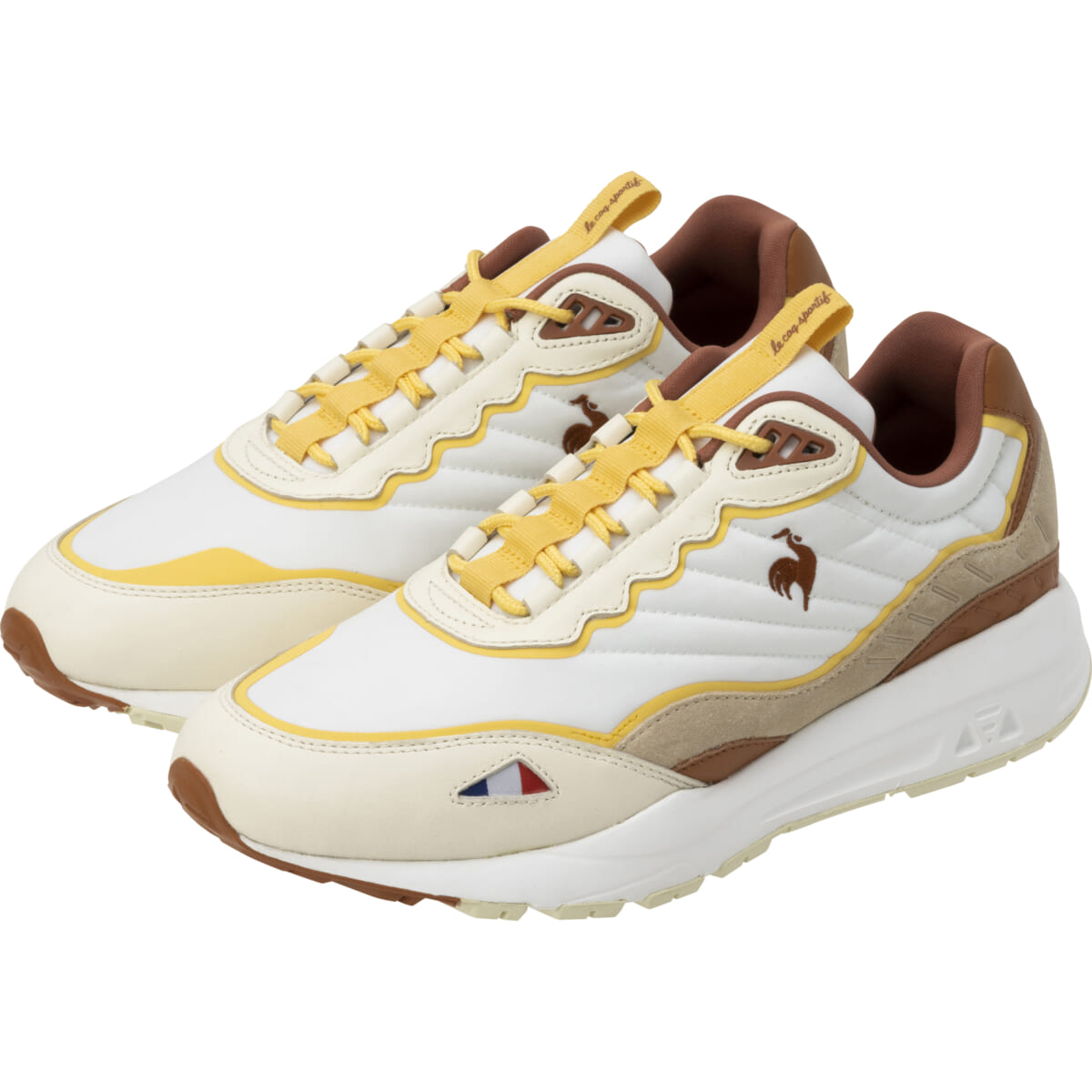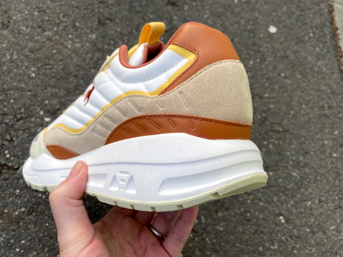 アッパーはナイロンをメインにオーバーレイにエコレザーを採用し、耐久性を高めながらサステナブルも実現。トウのサイドにはルコックスポルティフのDNAともいえるトリコロールを配して、アクセントとして効いています。