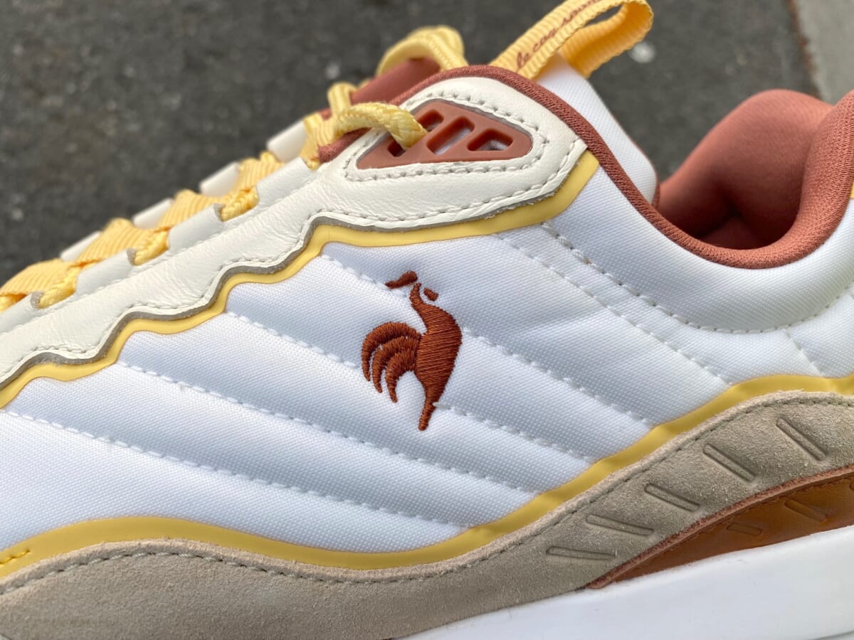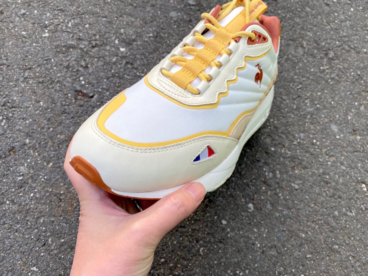アッパーのサイドにはフランスの国鳥であり、ルコックスポルティフのブランドロゴ“雄鶏”の刺しゅうをオン。