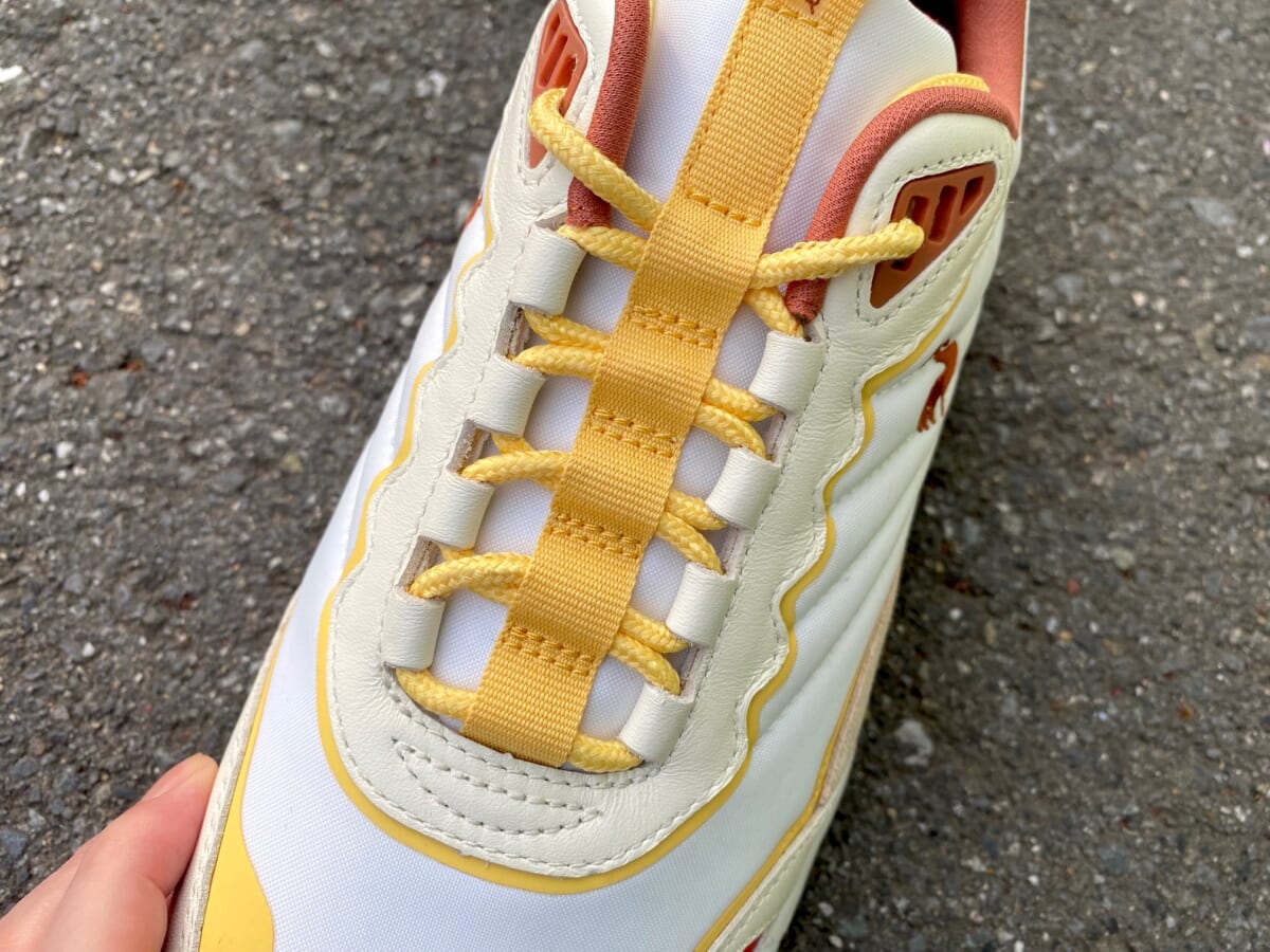 本作のデザインは「トリコロール」「鶏」「太陽」「台地」を各パーツの素材と色で表現しています。そして、トウやアイレットなどのオーバーレイにエコレザー、シューレースには再生ポリエステル材を使用するなど、サステナブルも意識。ソールには優れたクッション性と安定性を兼ね備えたZ1ソールを採用し、履き心地も申し分ありません!