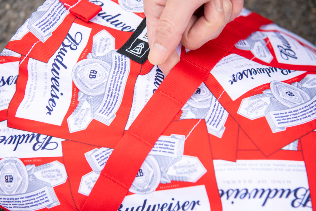 ボディは厚手のナイロンを使用。そこにクラシックなバドワイザーのロゴが折り重なるように配され、インパクトのあるデザインとなっています。