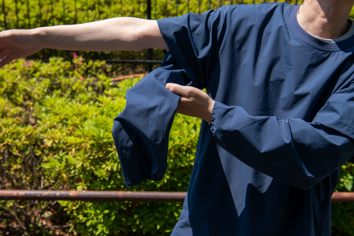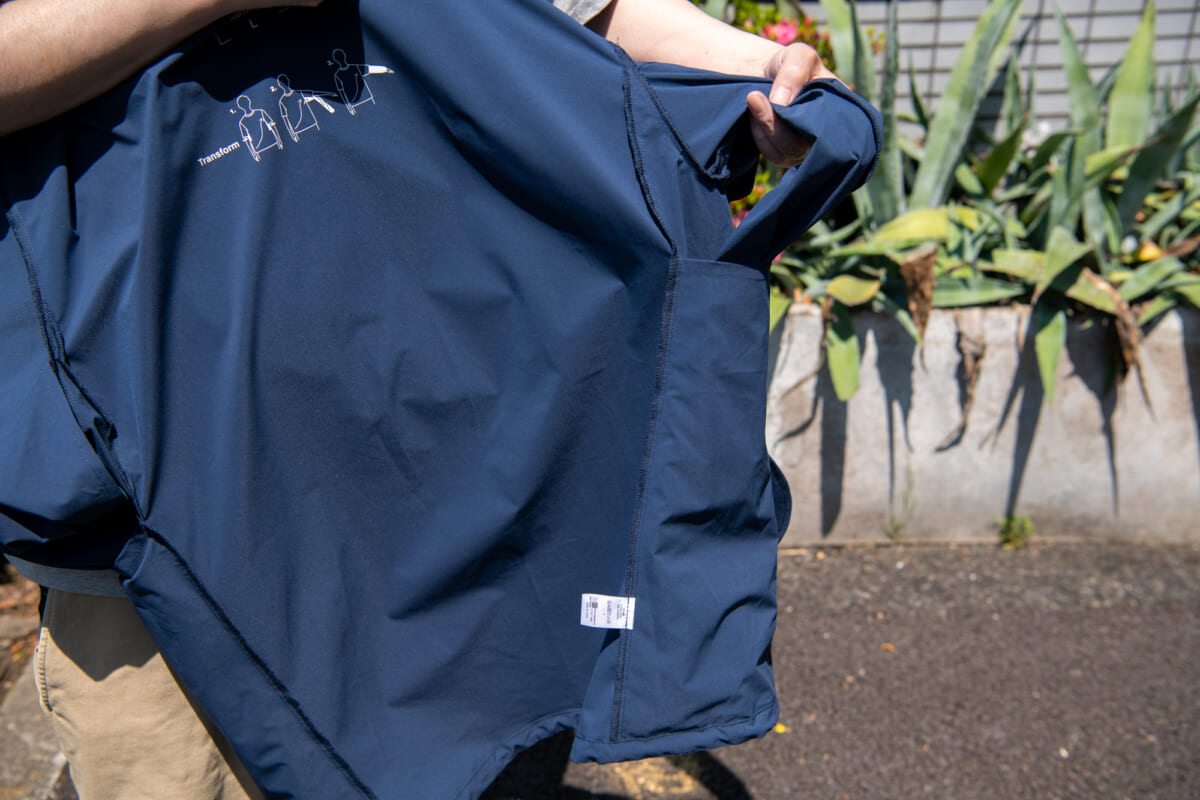 着たままで袖のロング丈、またはショート丈の切り替えが可能。身頃の内側には袖用のポケットが設けられていて、ショート時にはコンパクトに収納できます。