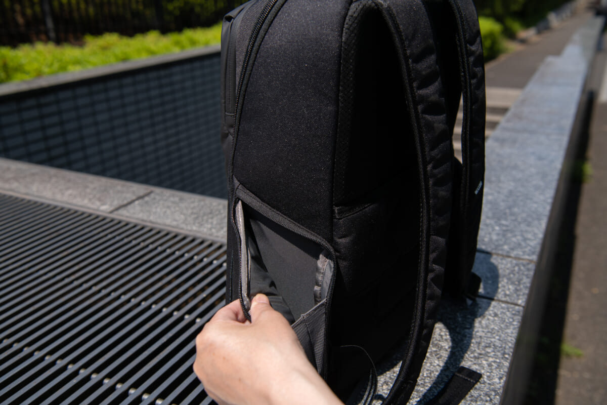 サイドパネルには、ドリンクボトルも収納可能な伸縮ジップ付きポケット付き。やや太いサーモマグボトルなどもOKですね。