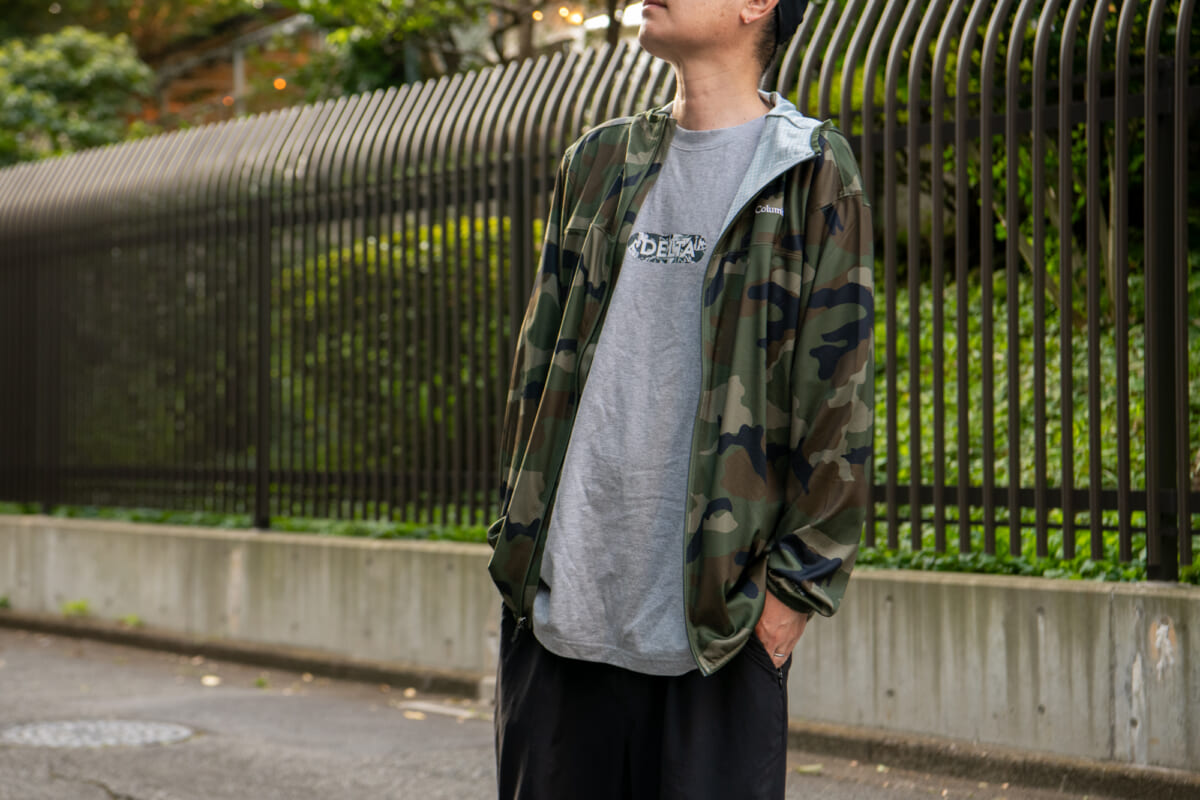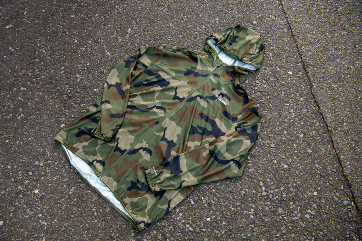 紫外線をブロックするサンプロテクション機能が日差しから肌を守ってくれます。カラーラインナップには、着用したウッドランドカモ柄もあり、アウトドアシーンにさり気なくフィットしますね。