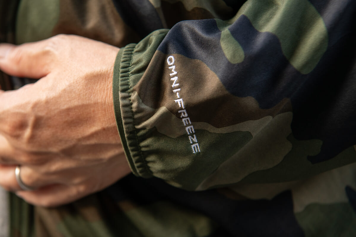 コロンビアが誇る冷却機能「オムニフリーズゼロ」。リング状の冷却素材が汗を利用し、生地をすばやく冷却してくれます。暑くて汗ばんでもサラッとした肌触りをキープ。