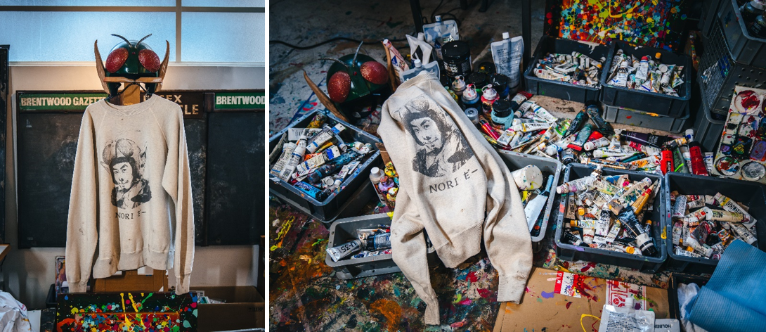 本コラボレーションでは、1986年から1997年まで放送されたバラエティ番組『とんねるずのみなさんのおかげです』内のコーナードラマ『仮面ノリダー』が題材となっています。幼い頃に同作を観て育ち、ファンであるSAINT Mxxxxxxのデザイナー細川雄太が、当時の仮面ノリダーを描き起こしデザインに落とし込んでいます。お馴染みの仮面ノリダーの肖像画の下には「NORI だー」のステンシルプリントが施され、キャッチ―な中にもSAINT Mxxxxxxのアイデンティティが反映されています。