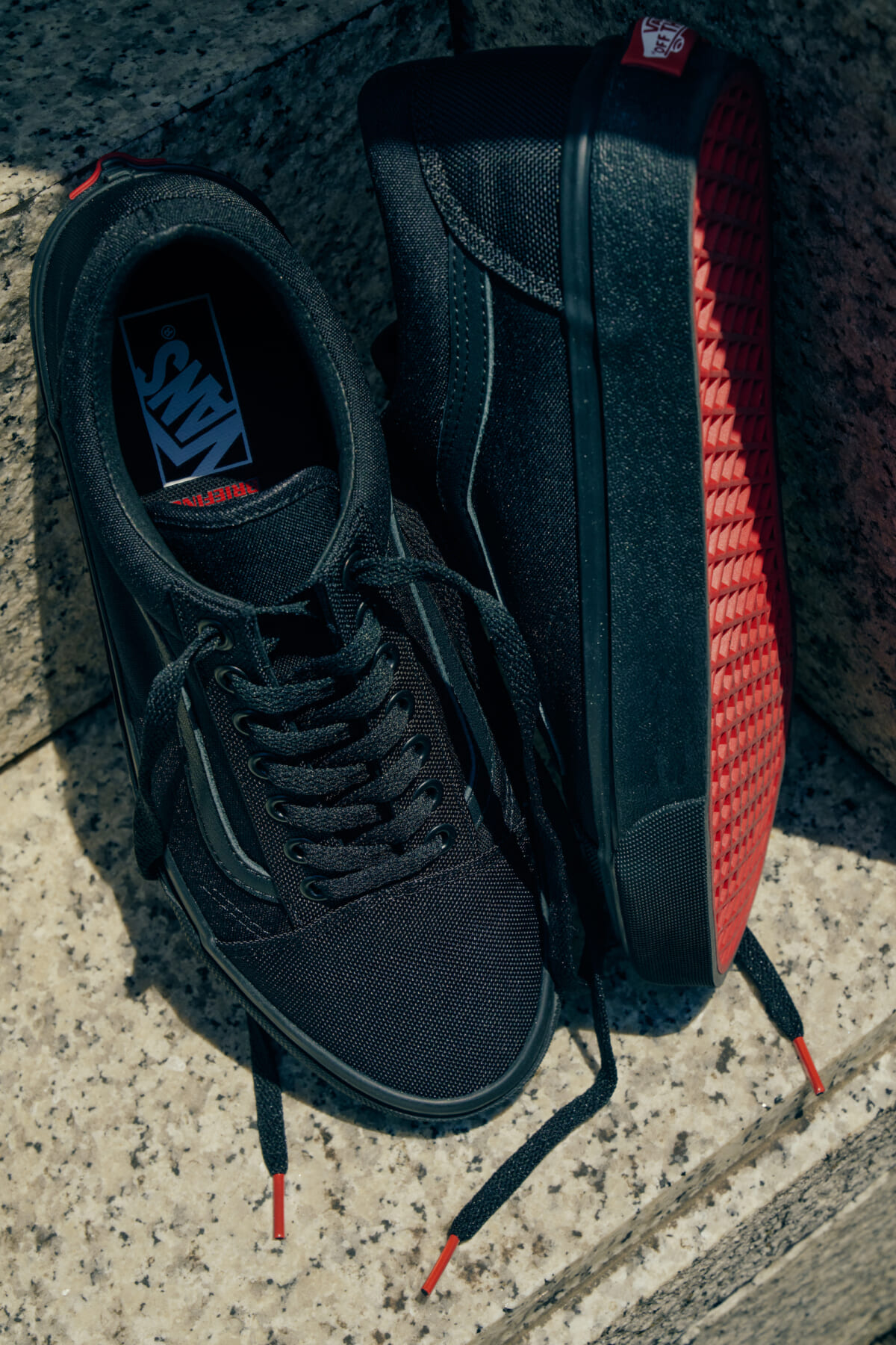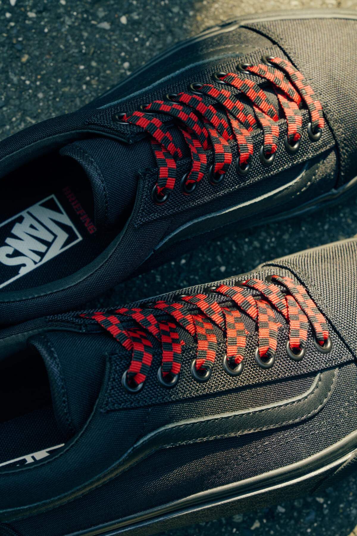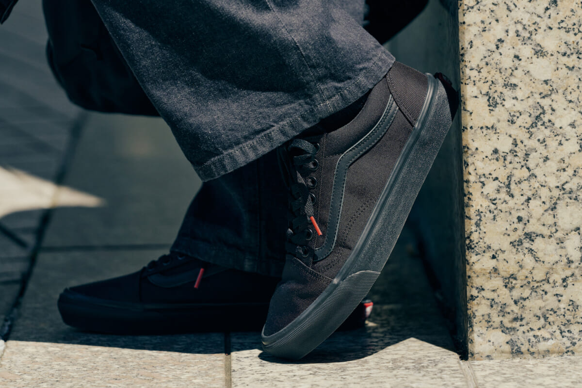 ブリーフィング25周年にふさわしいヴァンズとのコラボレーションシューズは、ブリーフィングのブランドカラーやマテリアルを使用し世界観を演出。「オンオフ問わず履いてもらいたい」という思いから、アッパー部分はオールブラック仕様に。ビジネスカジュアルなスタイリングにもマッチするよう、 シューレースデザインも紐先のみにレッドカラーを落とし込んだシンプルなデザインに仕上げています。