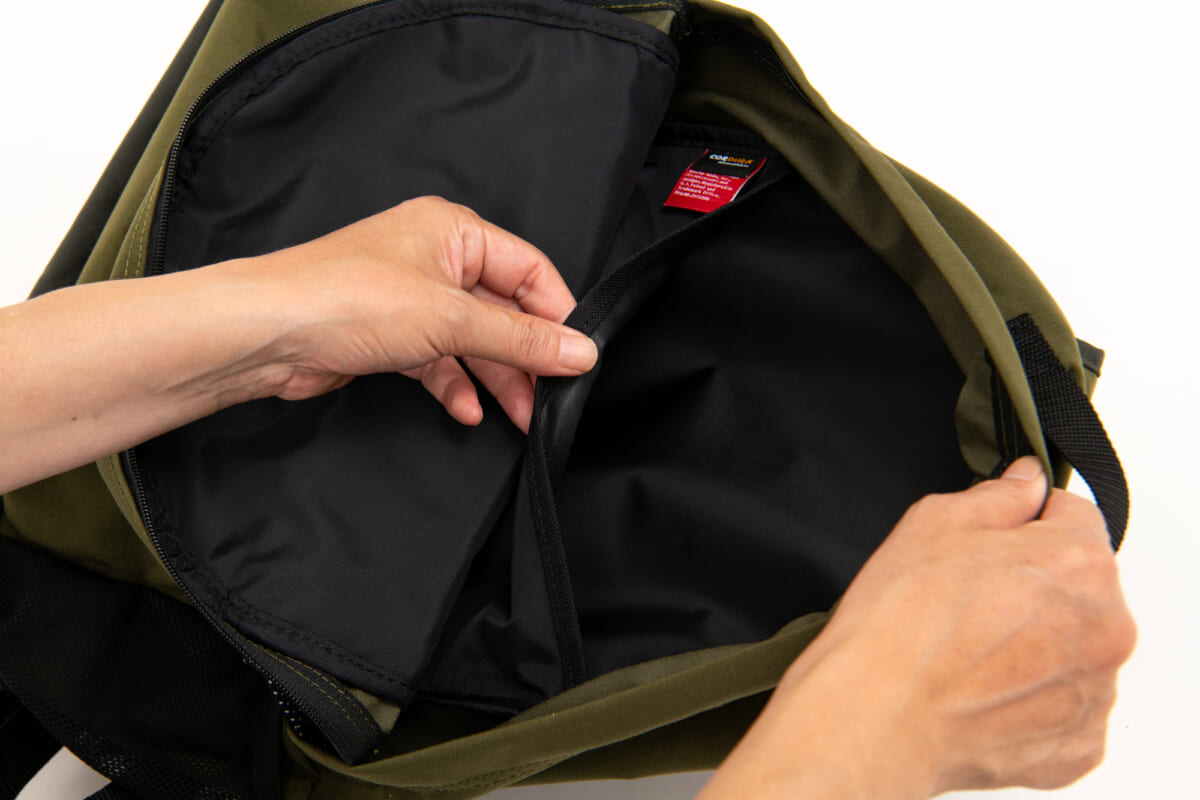 裏地には防水素材を貼り合わせ、水気や汚れを簡単に拭き取ることができます。そしてメインコンパートメントにはA4サイズのPCが収納可能なスリーブも内蔵。