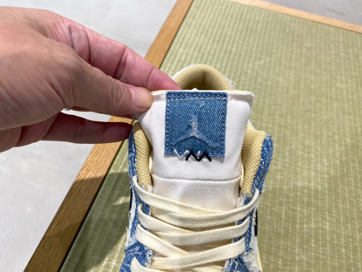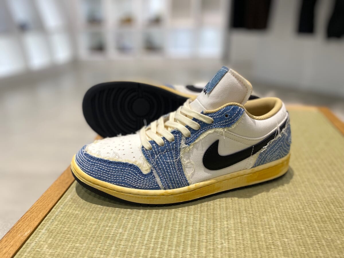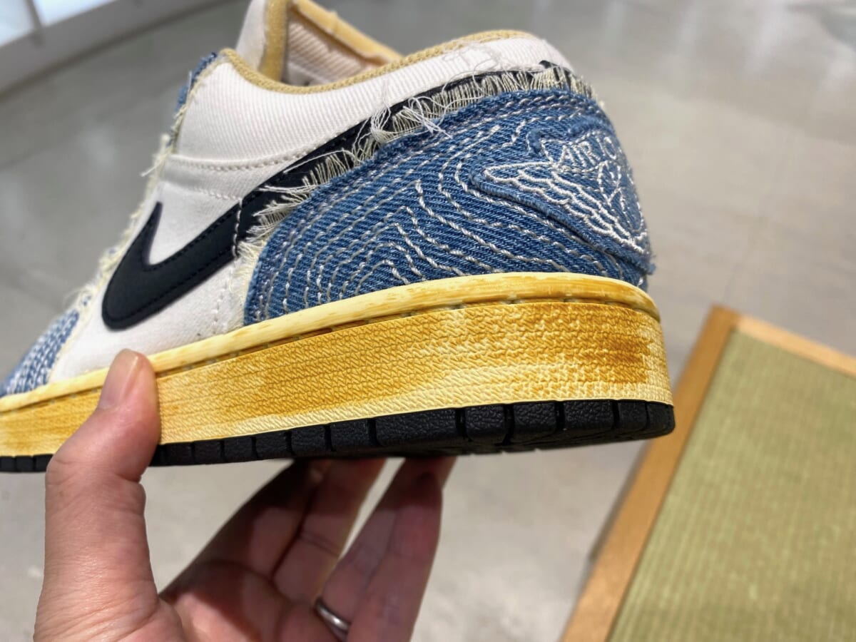 こちらが日本をテーマにした「エア ジョーダン 1 LOW」。まさに美しさと洗練さを結集した一足です。オフホワイトのキャンバス地がベースとなり、そこにデニムのオーバーレイが織り交ぜられています。この組み合わせは、日本の伝統とモダンな要素が見事に融合したデザインと言えるでしょう。さらに日本の伝統工芸である「刺し子」を彷彿とさせるステッチが施されています。これにより、靴自体がまるで職人の手仕事のようなクラフト感と独自性を放っています!