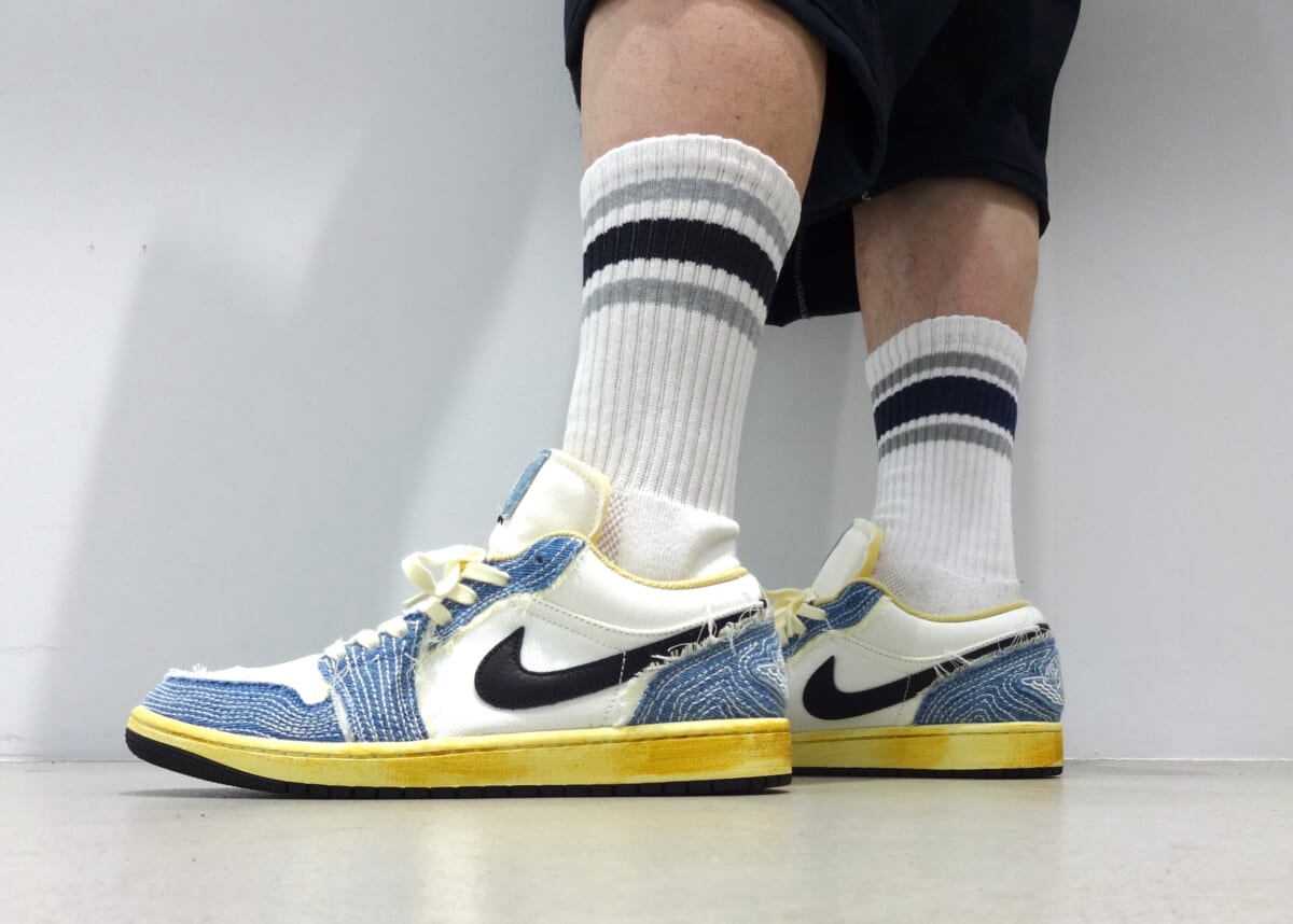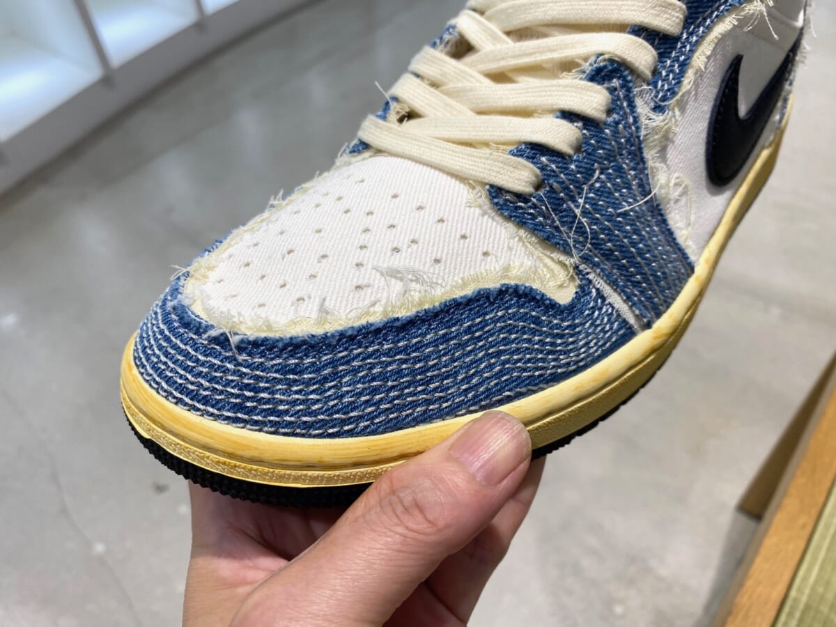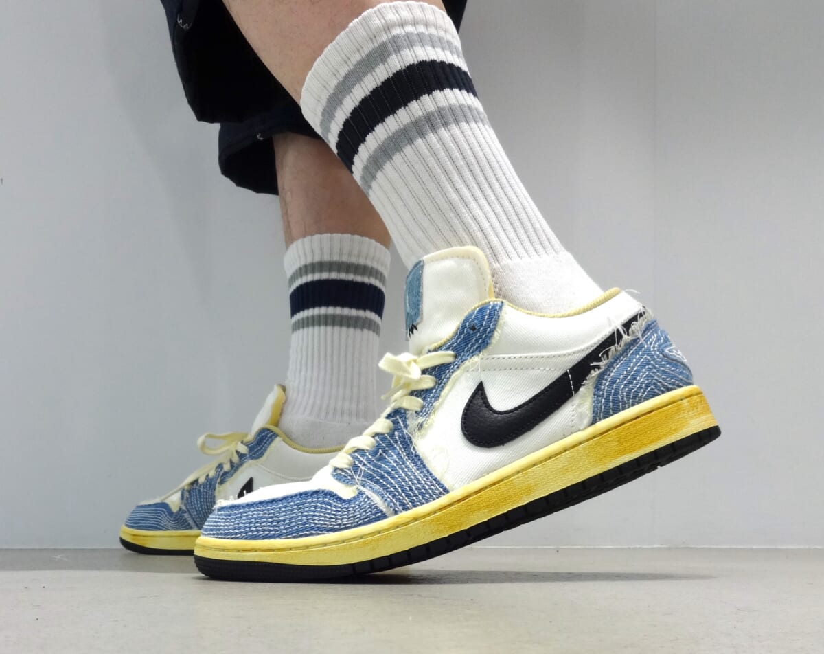 こちらが日本をテーマにした「エア ジョーダン 1 LOW」。まさに美しさと洗練さを結集した一足です。オフホワイトのキャンバス地がベースとなり、そこにデニムのオーバーレイが織り交ぜられています。この組み合わせは、日本の伝統とモダンな要素が見事に融合したデザインと言えるでしょう。さらに日本の伝統工芸である「刺し子」を彷彿とさせるステッチが施されています。これにより、靴自体がまるで職人の手仕事のようなクラフト感と独自性を放っています!