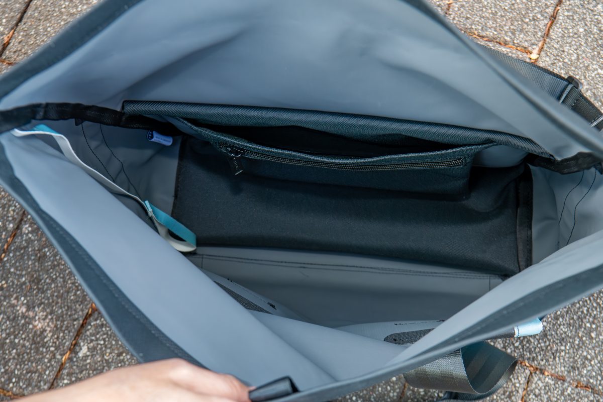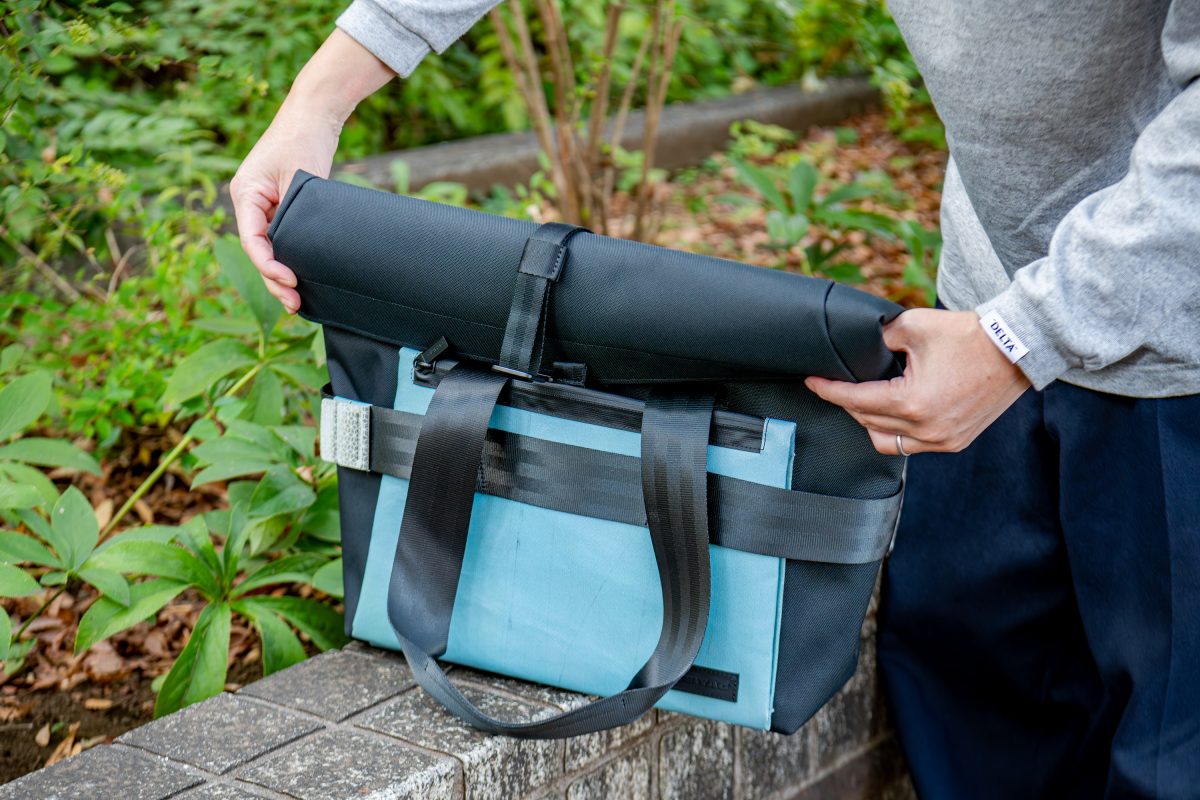 ロールトップなのでカバンの中の荷物容量によってサイズを変えられるほか、防水性も強化。