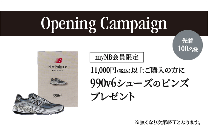 myNB会員を対象に、1万1000円(税込)以上購入の先着100名に、ニューバランスの「990v6」をデザインしたピンズをプレゼント。