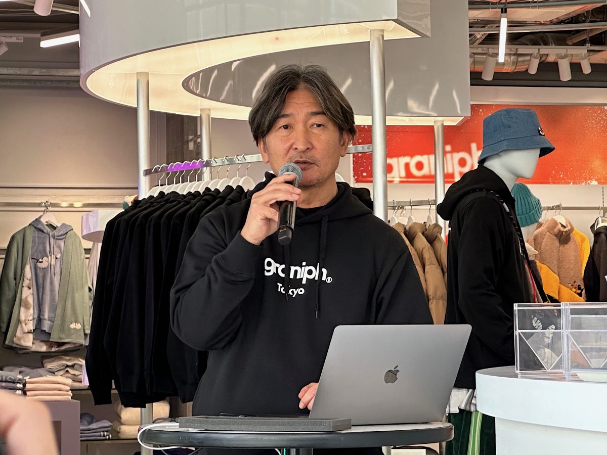 「Tシャツブランドのイメージを払拭し、ポップカルチャーを融合した、ライフスタイルを提案するグラフィックブランドであるという印象を持ってもらいたい。そのために、今回グラニフ東京をオープンしました」と、メディア内覧会にて登壇したグラニフ代表取締役社長・村田昭彦さん。