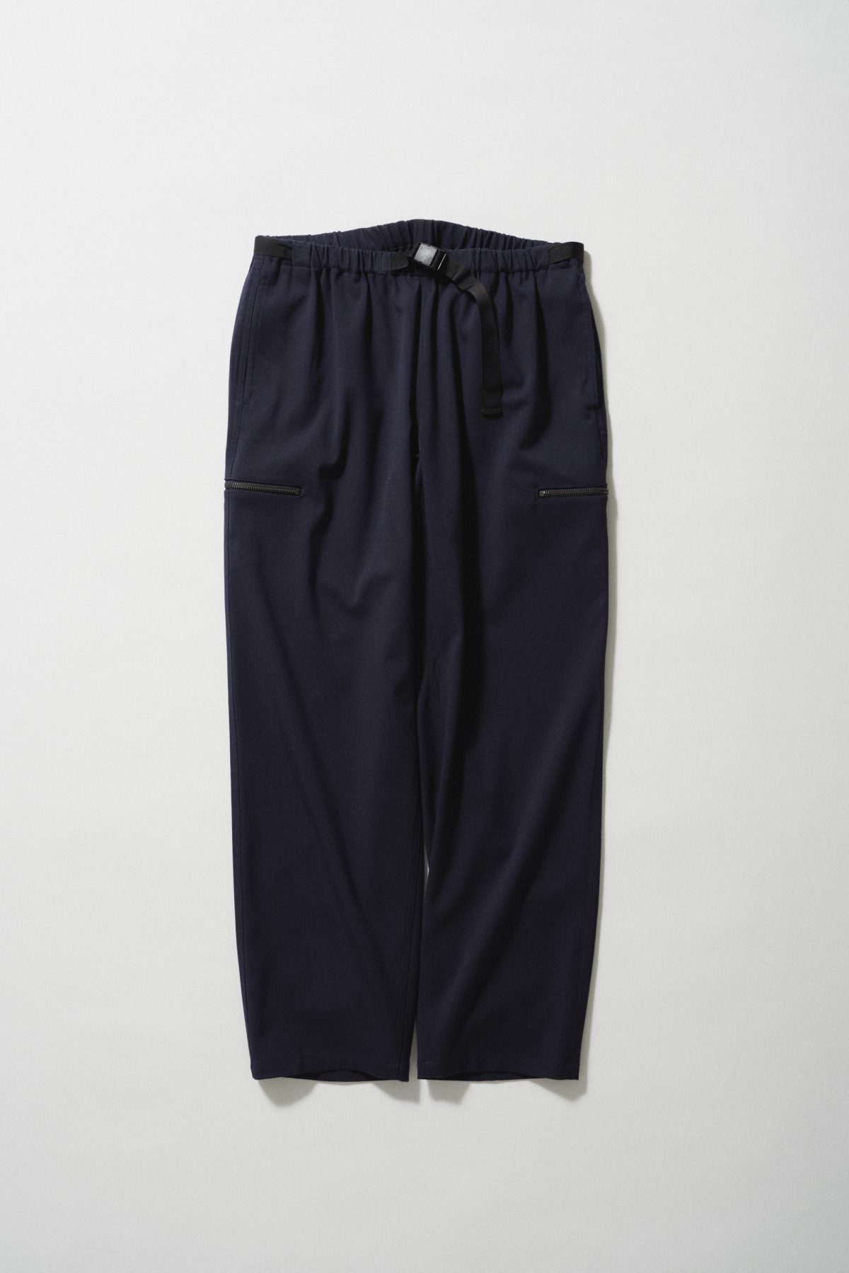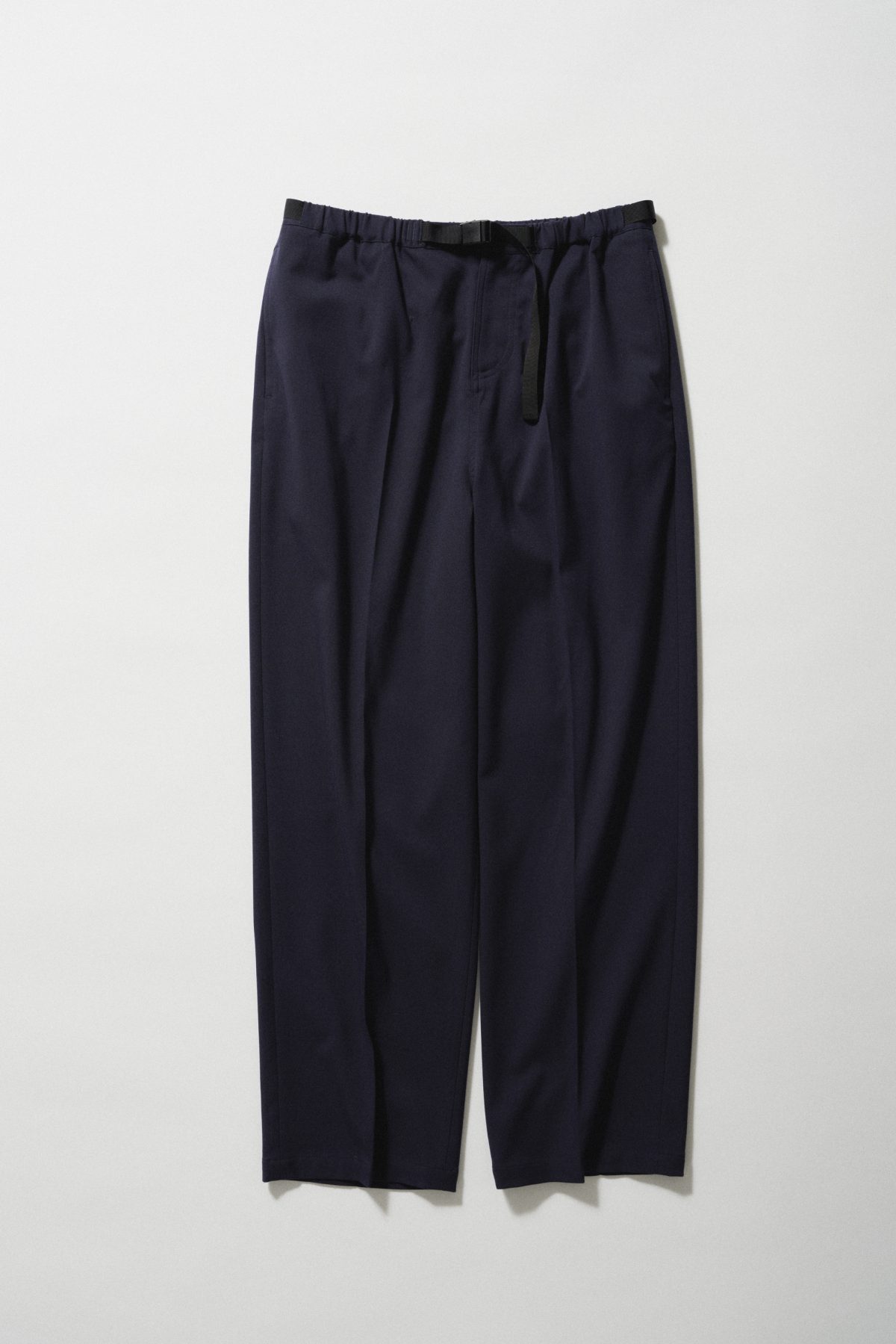 クラシックなスタイルでは外せないスラックスとアクティブ要素を掛け合わせたパンツ。 程よいワイドシルエットは、セットアップ、単体でも活躍します。ウエストにはボルダリングウェアの要素を取り入れて、ウェービングベルト仕様に。