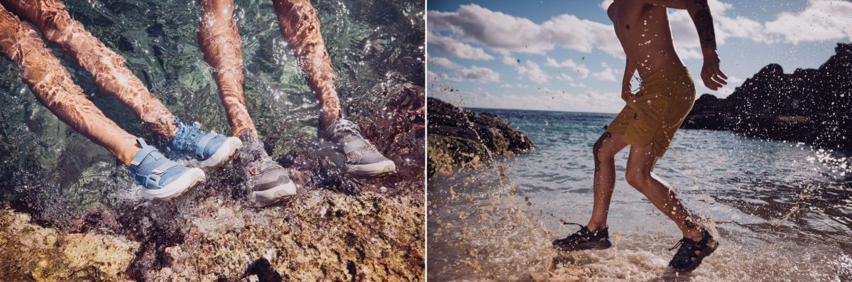 また水が抜ける構造のサイド穴あきデザインのアッパーは速乾性が高く、岩や砂なども排出するので、水辺でのアクティビティをより快適にします。100%再生ポリエステルのマイクロファイバーの裏地が足を柔らかく包み、バンジーコード(伸縮性のあるコード)のレースが足をホールドします。再生素材を15%使用したEVAトップソールとEVAミッドソールは、クッション性が高く、軽やかなステップをサポート。新色はビビットなイエローとグレーの2トーンで、モダンな雰囲気を演出。