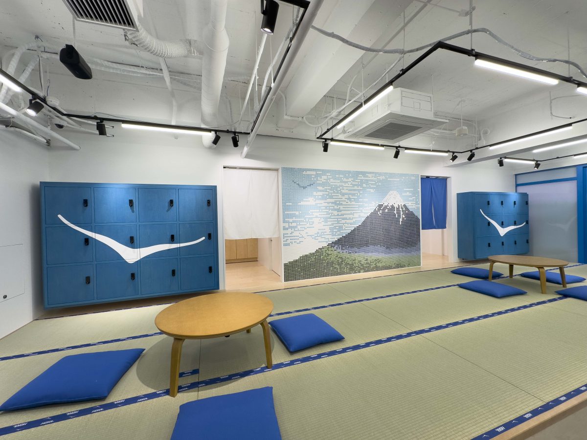 そしてユニークなのが、2階のコミュニティスペース。タイルで描かれた富士山にロッカー、さらには靴を脱いでくつろげる畳のスペースが目に飛び込んできます。ここはHOKAの公式ランクラブ「HOKA RUN CLUB」のコミュニティスペースとなり、HOKAの最新シューズを試走したり、HOKAアンバサダーやHOKAアスリートに会える特別なイベントを実施していく予定です。