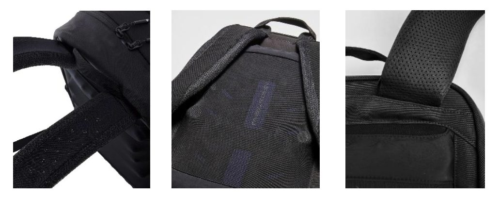 背面に加え、ショルダーハーネスもパンチング仕様にすることで肩周辺の不快感も軽減。さらに、ショルダーの付け根を肩の形状に沿うように「ハの字」設計で縫製することにより肩への負荷が全体に分散され、体感としても軽く、体への負担も軽減されることが期待できる設計に。