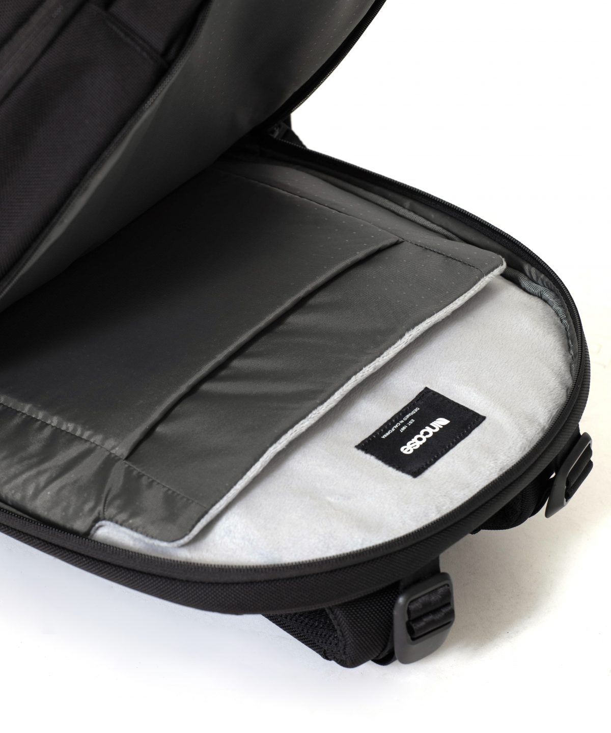 本体生地には、Incaseとして初めて1680デニールのコーデュラバリスティックナイロンを採用。街の雑踏を通り抜けるときや枝葉が鬱蒼と伸びた森林を通り抜けるとき、荒れた岩肌の上にバッグを置いたときなど、生地に与えるダメージを最小限に留め、長期にわたる使用を可能にします。