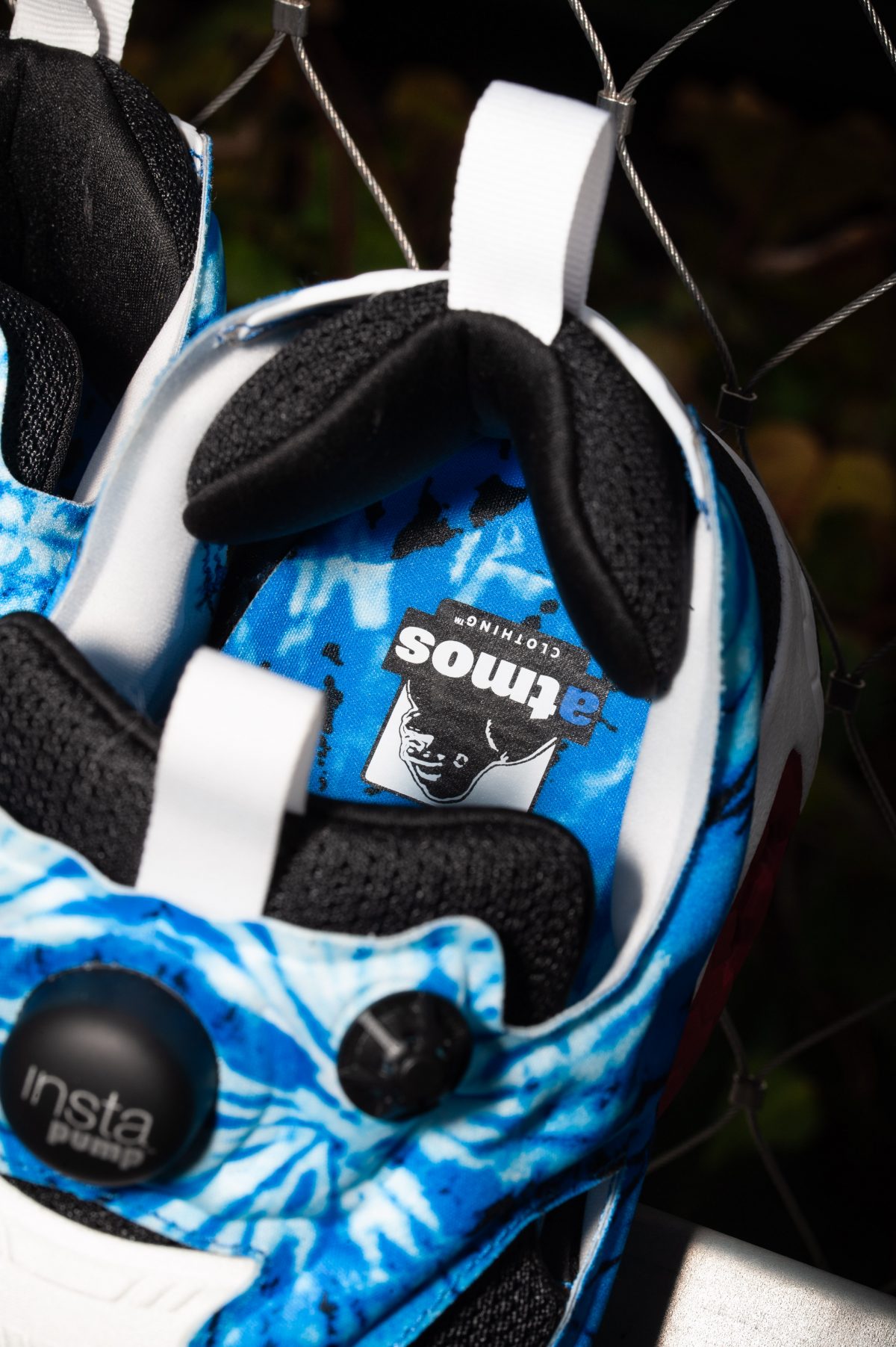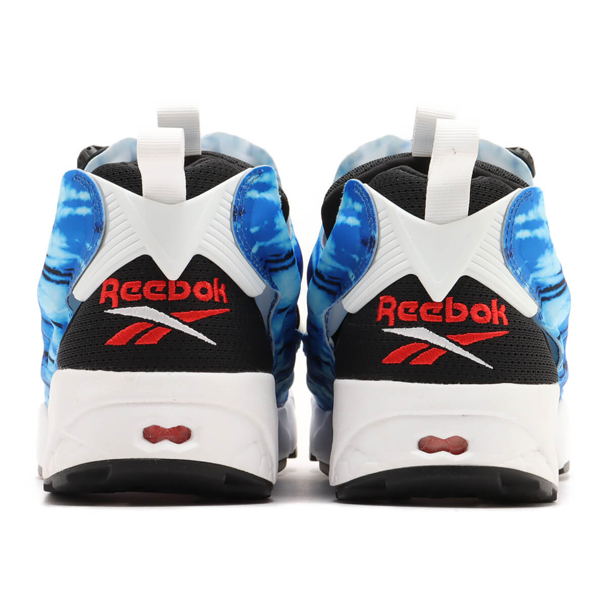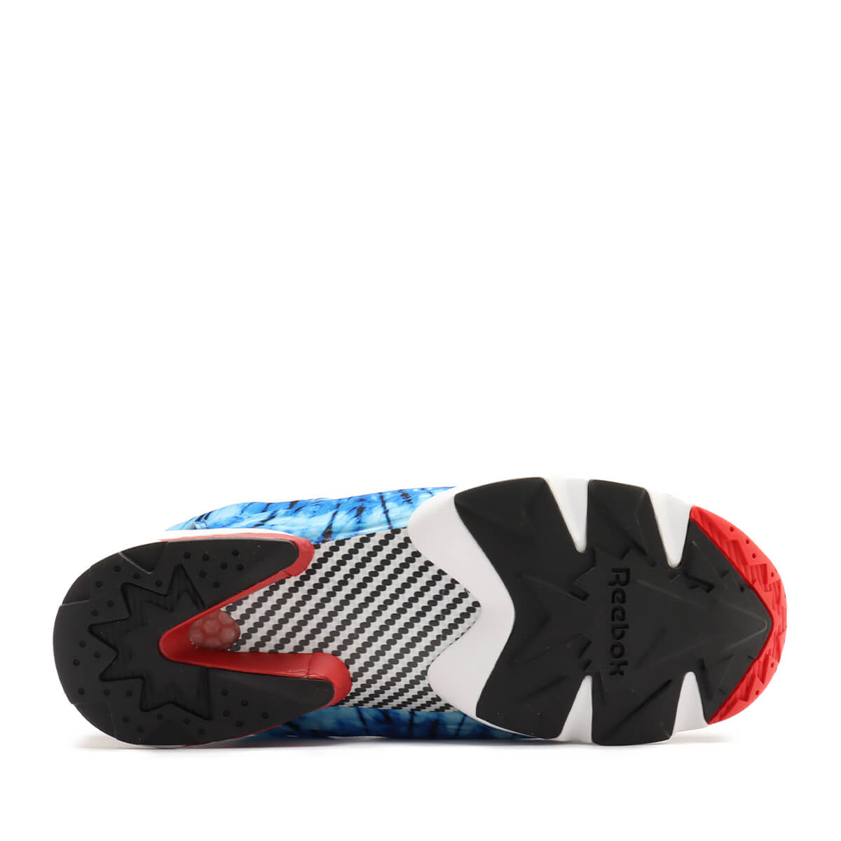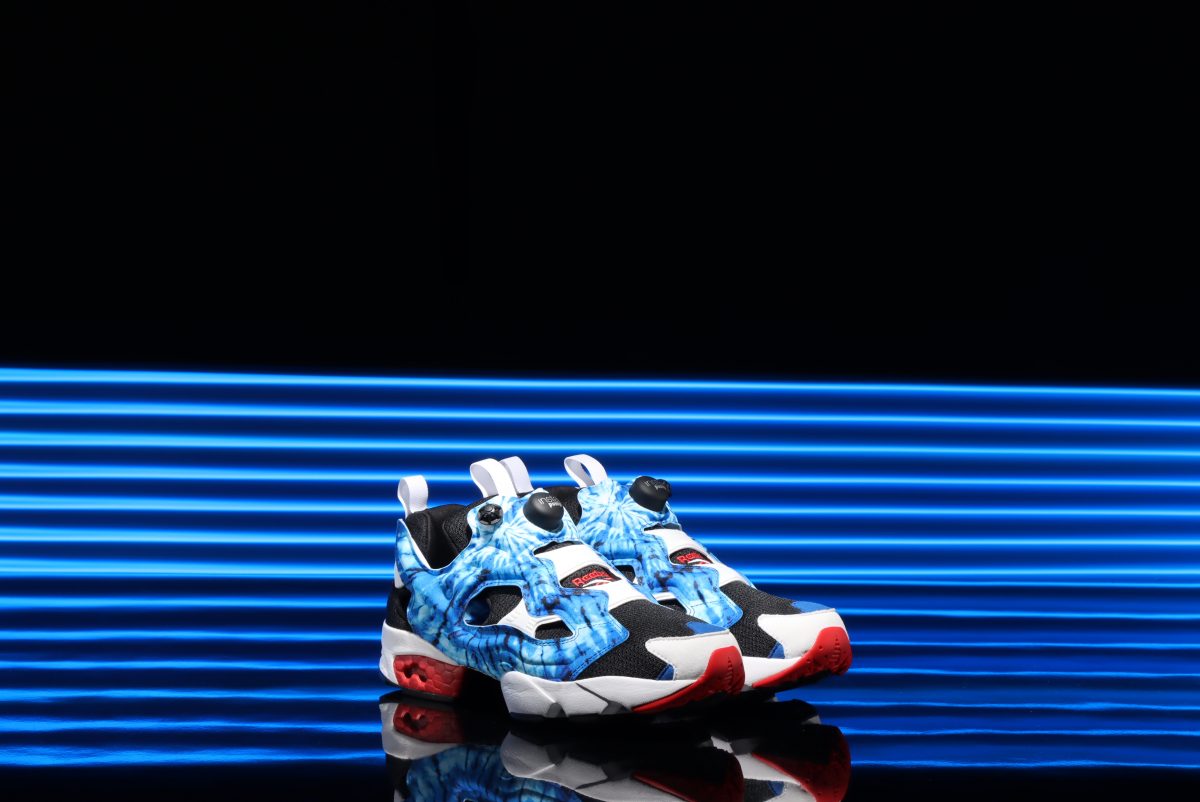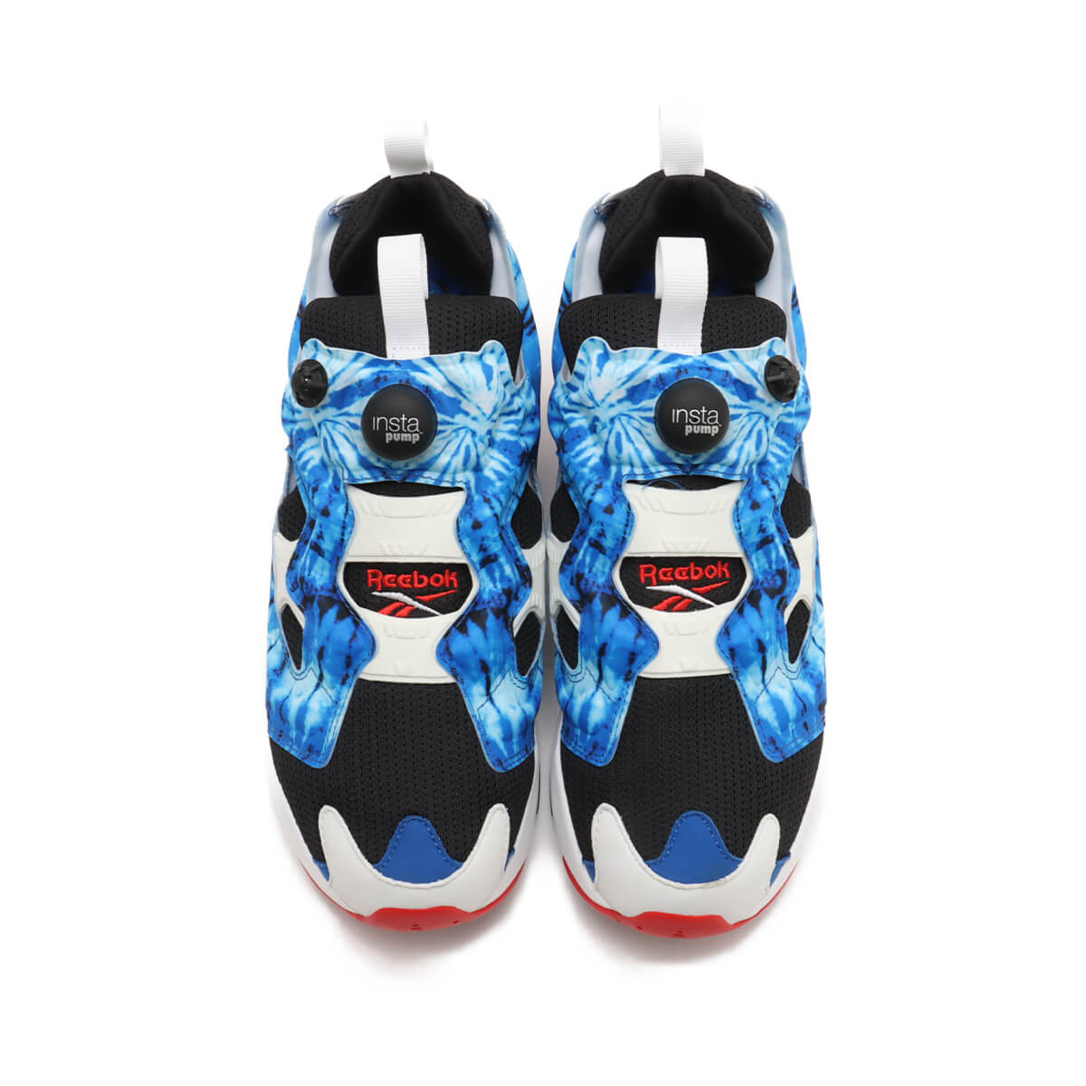 そのReebok INSTAPUMP FURY 94をベースに採用し、OGカラーの配色を活かしながらアッパーのポンププラッターにオリジナルのタイダイ柄を落とし込んでいます。シュータン中央部分とヒール部分には、Reebokのベクターロゴ。トリプルコラボレーションならではのスペシャルな仕上がり。