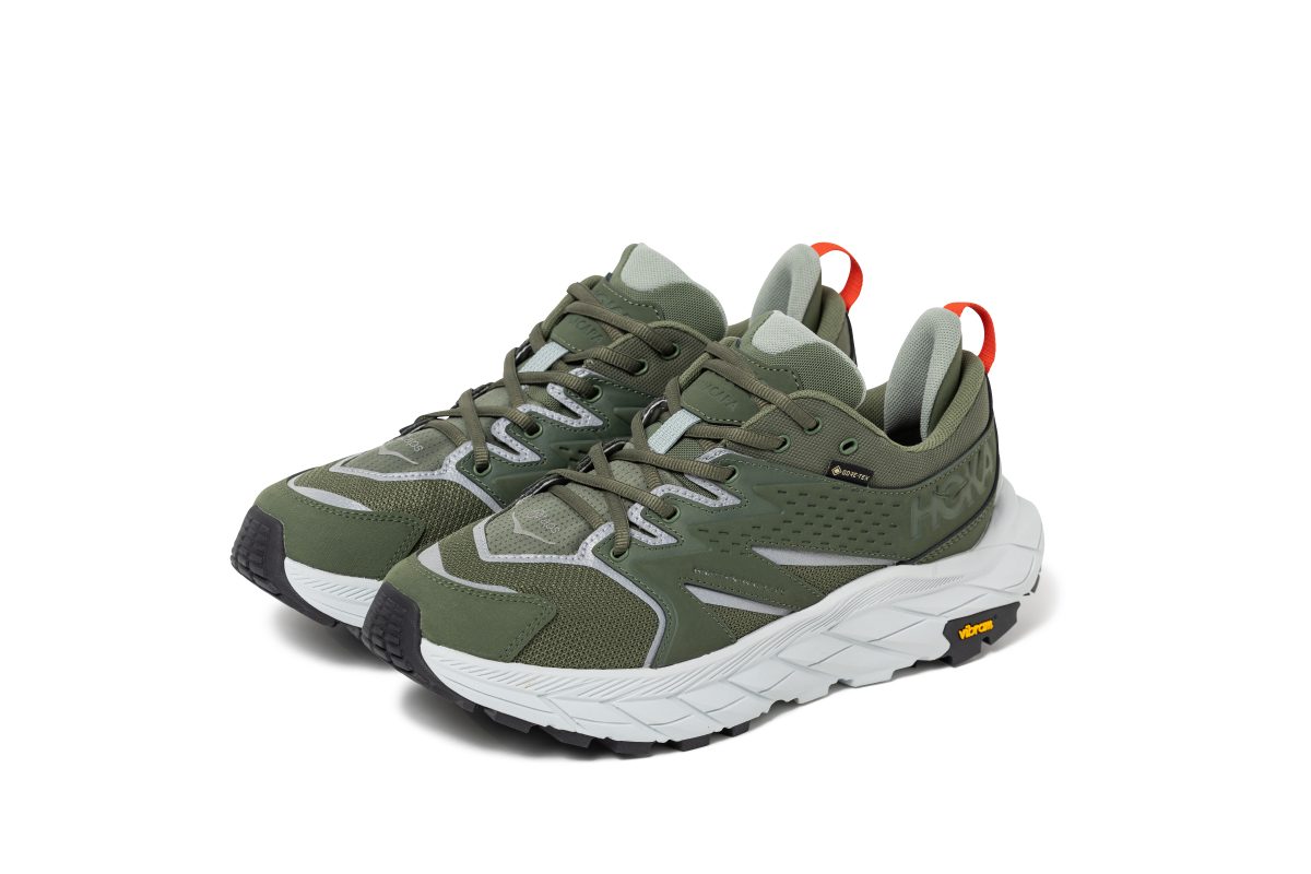 HOKAが東京を拠点とするWTAPSとタッグを組み、ANACAPA LOW GTXにエッジの効いた美学を注入しました。用途の広い防水デイハイカーを漆黒とオリーブの色調でアップデート。シルバーデボスプリントでグラフィックを表現しています。スペシャルシューズボックスが付属。
