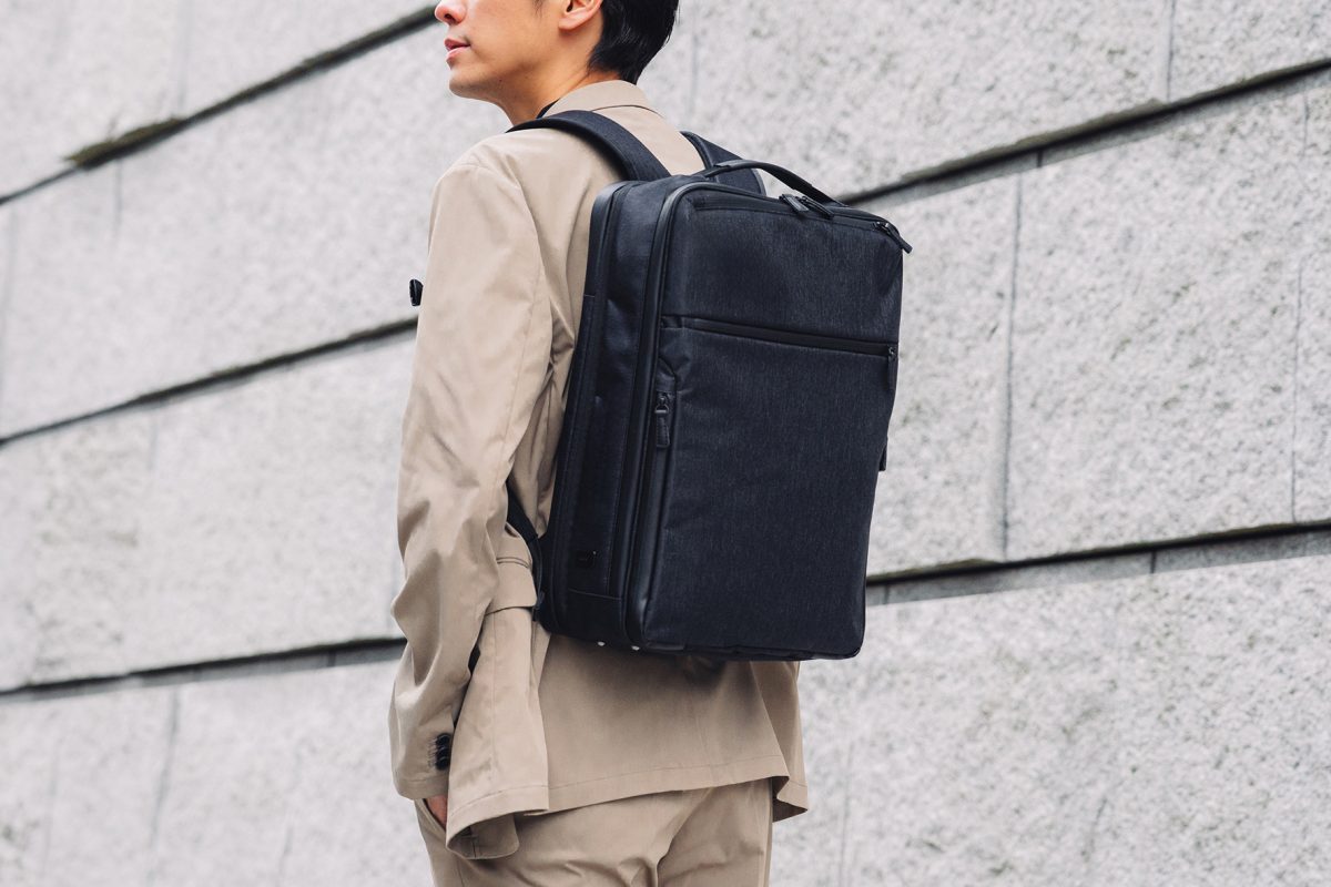 アウトドア要素を取り入れたアスレジャースタイルと、都市生活に適した機能性を融合したオンオフ兼用バックパック。生地の製造プロセスで発生する廃材を利用したリサイクルコーデュラナイロンを、キメ細かで上品な手触りながら扱いやすいマイクロファイバー合皮で切り替えることでタフさと上品さを両立。本体生地全体に施した撥水加工と止水ファスナーで悪天候に対応します。背中が蒸れるのを防ぐため背面にベンチレーション機能を設けており、底面のテープで畳んだレインウェアや折りたたみ傘をリュックに固定することができます。
